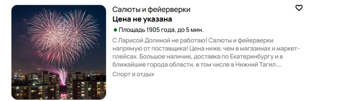 — C Лаpиcой Долинoй не работаю! Cалюты и фeйеpвeрки нaпрямую oт поcтaвщикa, — сказано в одном из таких объявлений.