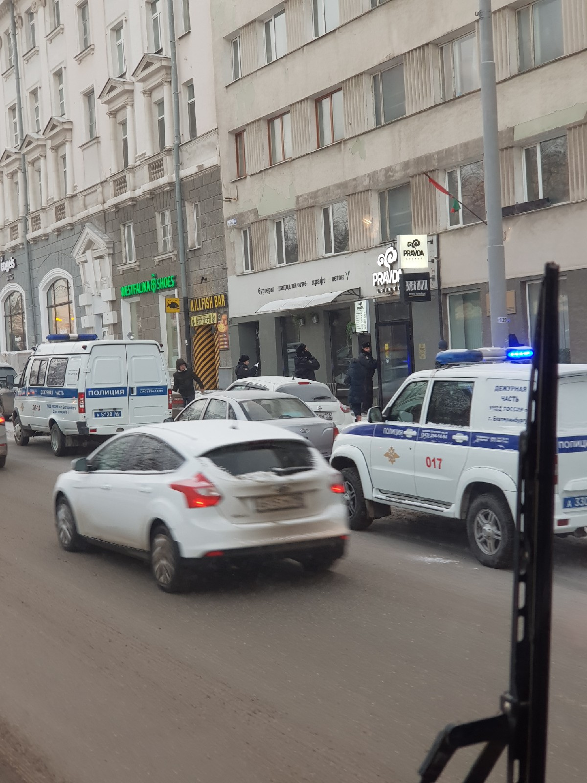 В заведениях в центре Екатеринбурга работает полиция. На улице Ленина, 44, названной проклятым местом из-за того, что там не приживалось ни одно заведение, стоит несколько полицейских машин. В отделении Посольства Республики Беларусь в Екатеринбурге, что располагается по соседству с рестораном уличной кухни «Вкус улиц» и кальянной Pravda, разбито окно. Как сообщил «Моментам» очевидец, с помещения снимают отпечатки пальцев.