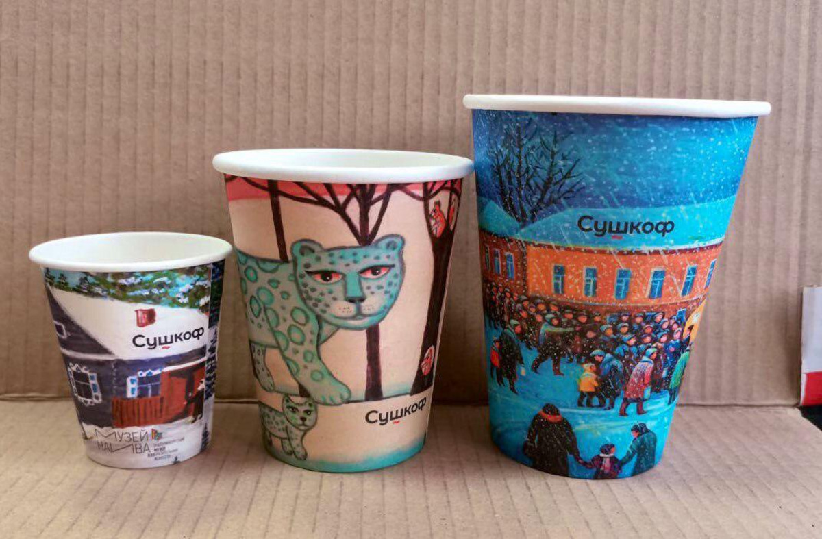 На стаканчиках изображены картины, которые можно увидеть в Музее наивного искусства, который является частью Музея ИЗО. Всего три вида: «Снежный барс» Алевтины Пыжовой, «Лыжник» Нины Барановой, «Очередь за молоком» Павла Устюгова. Как сказали «Моментам», это сделано, в частности, для привлечения новых посетителей.