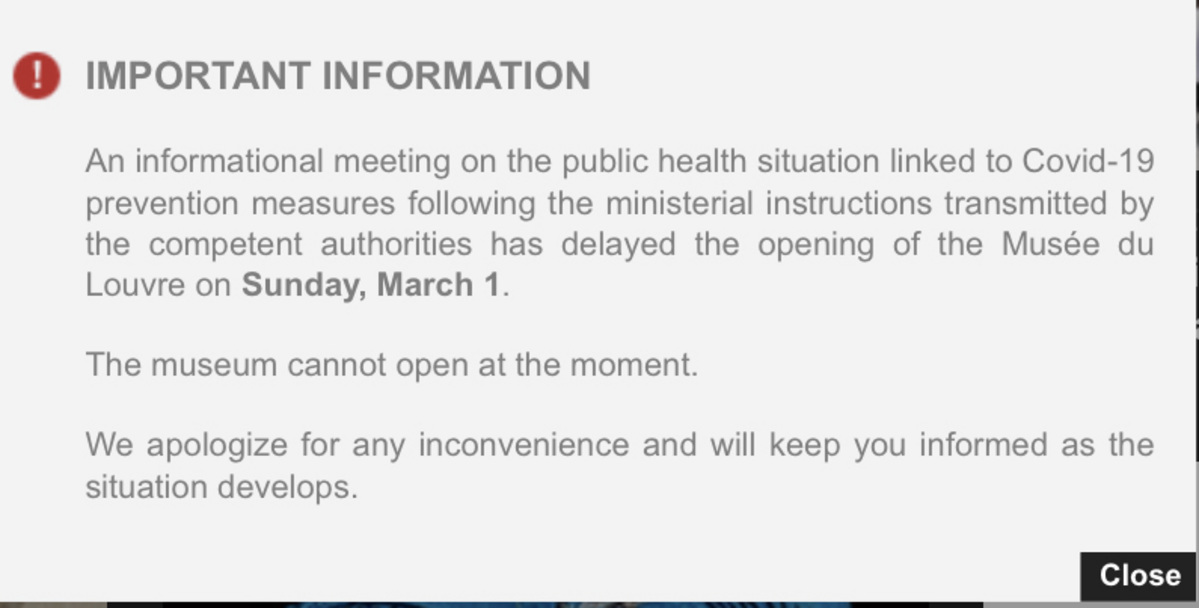 Согласно официальному сообщению Лувра, музей закрыт в воскресение, 1 марта. Эти меры были приняты для экстренного совещания по профилактике распространения коронавируса. В своем решении руководство музея ссылается на рекомендации министерства здравоохранения Франции. О дальнейшем режиме работы пока не сообщается.