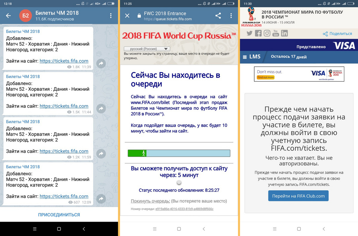 Получать сведения о выбросе билетов можно через телеграм-канал «Билеты ЧМ 2018» по ссылке @wc2018checker. Сначала нужно «отстоять» очередь, чтобы попасть на сайт FIFA, это занимает от 5 до 10 минут. Однако прежде чем начать процесс подачи заявки на покупку билета, нужно создать учетную запись на официальном сайте. Сведения о свободных билетах выбрасываются в телеграм-канал мгновенно, у вас срабатывает оповещение, и увеличиваются шансы выхватить билет.