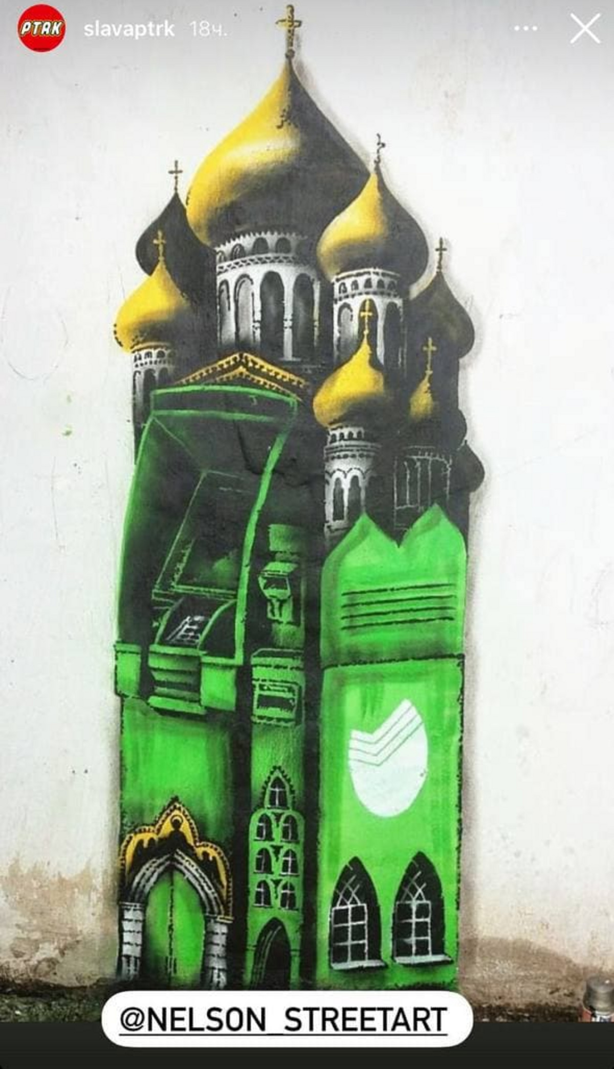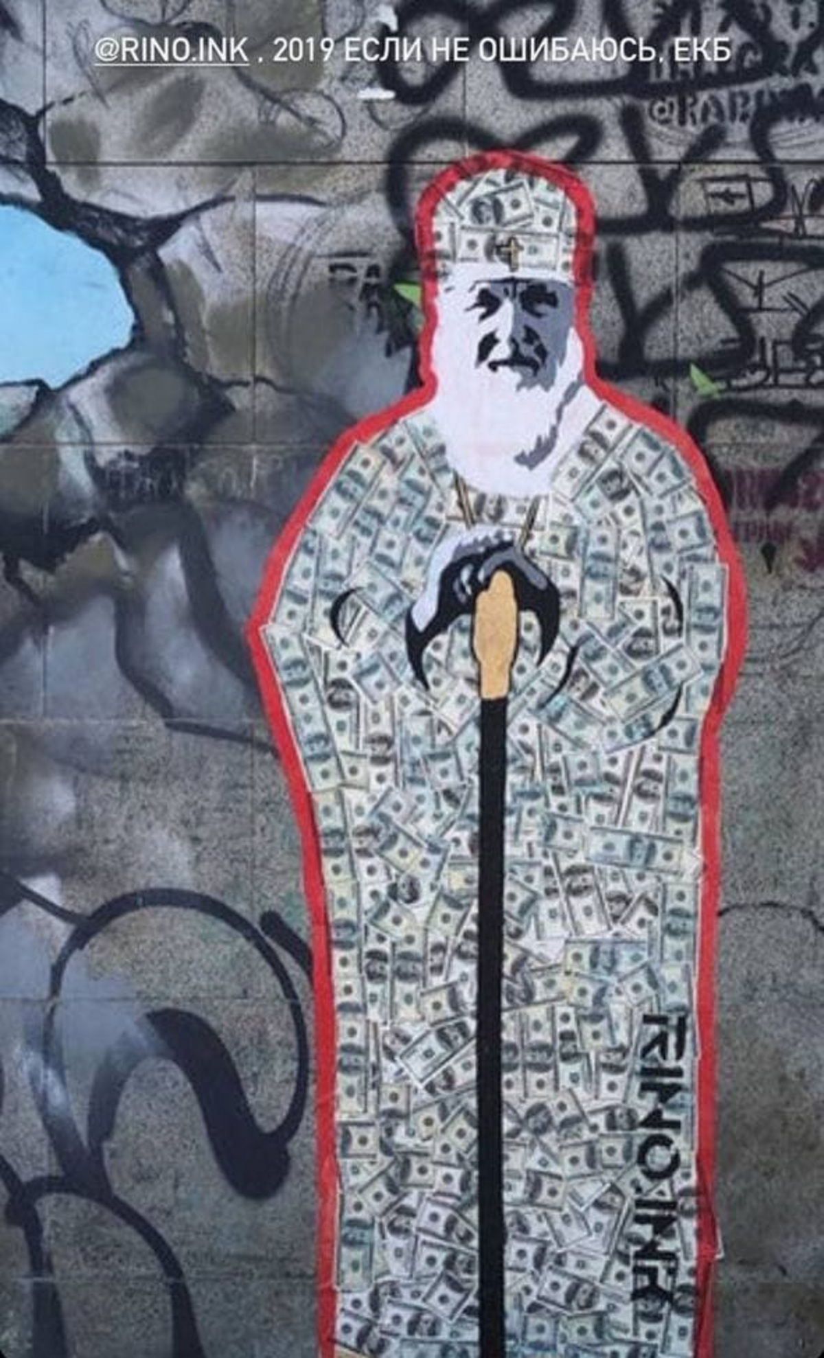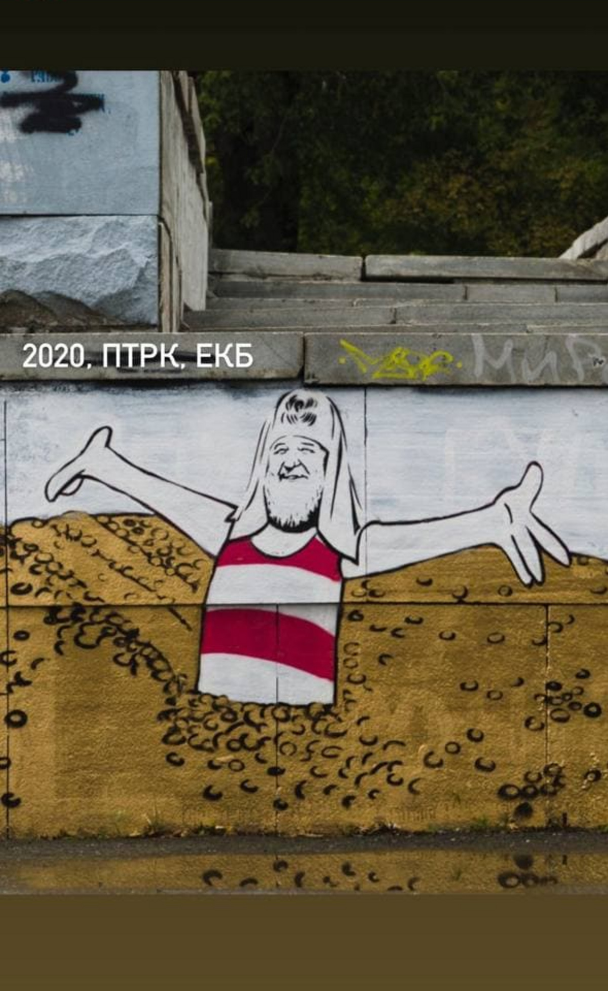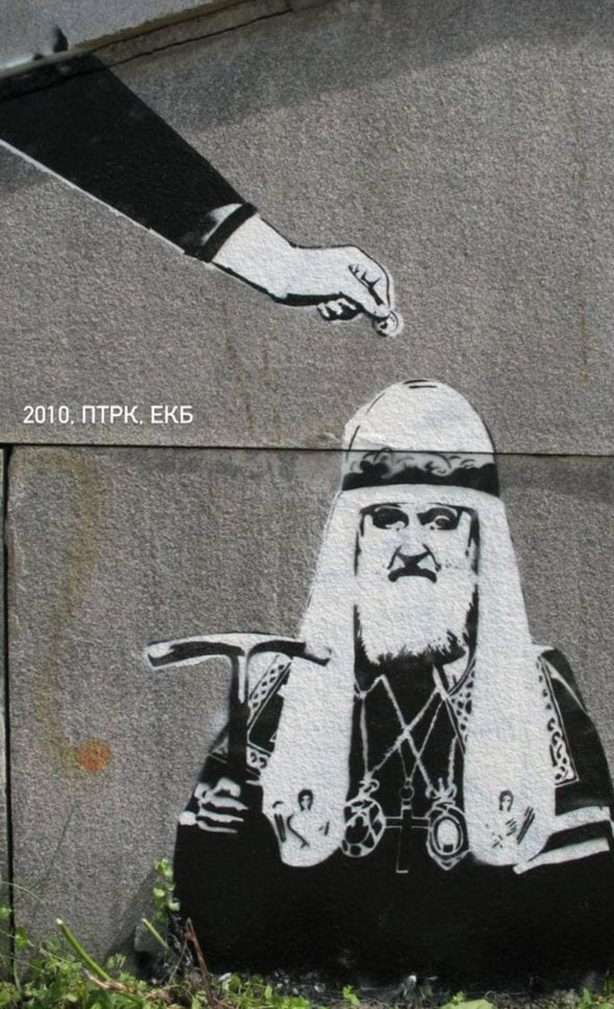 Уличный художник и создатель независимого фестиваля «Карт-Бланш» Слава ПТРК опубликовал в своем Instagram* подборку стрит-артов, посвященных РПЦ. Так он решил высказаться о последних резонансных уголовных делах, которые возбудили против молодых блогеров, фотографирующихся полуголыми перед храмами.