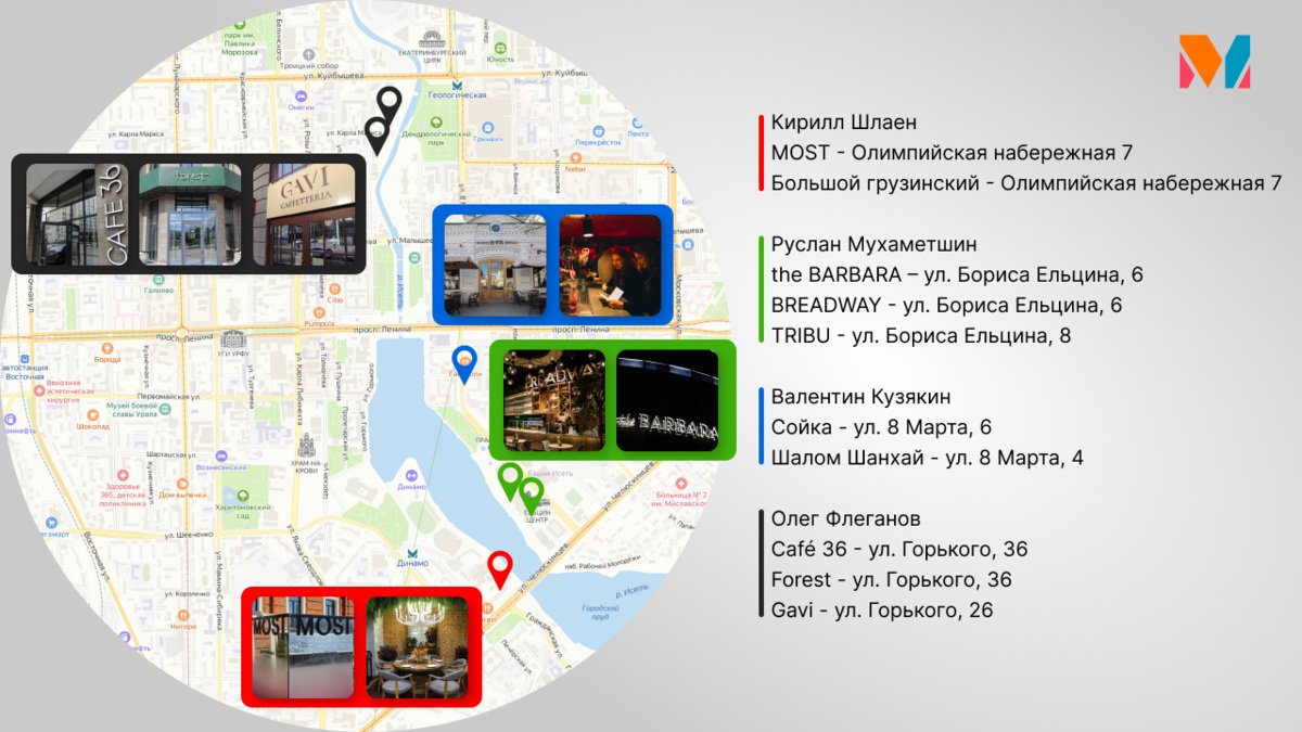 Ресторатор Валентин Кузякин открывать свои заведения решил на правом берегу реки Исеть. Они находятся неподалеку от набережной. Ближе всего «Сойка» и «Шалом Шанхай». Остальные его рестораны также разбросаны справа от реки.