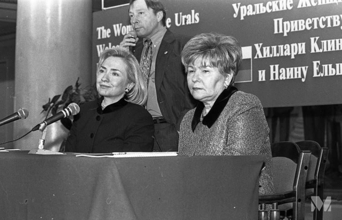 Хиллари Клинтон в Екатеринбург приехала с первой леди Наиной Ельциной 16 ноября 1997 года, для встречи со студентами УПИ. В вузе к такому событию готовились несколько дней. Для этого построили специальную платформу для вип-гостей, а напротив нее установили конструкцию для фотографов и операторов. Во время своего визита в Екатеринбург первая леди США посетила не только УПИ — вместе с Наиной Ельциной они заглянули в Музей изобразительного и камнерезного искусства, а после отправились на завтрак к экс-губернатору Свердловской области Эдуарду Росселю.