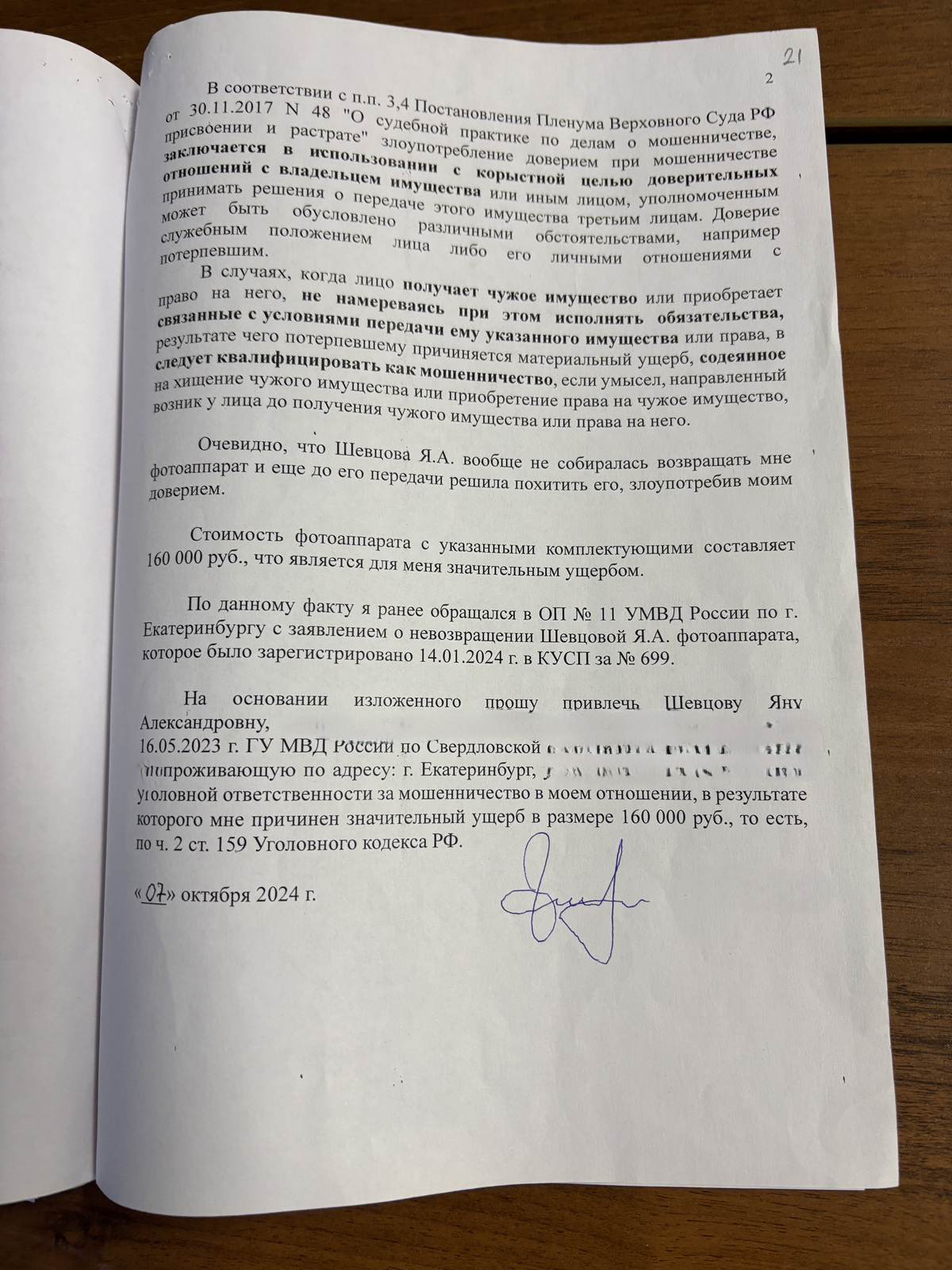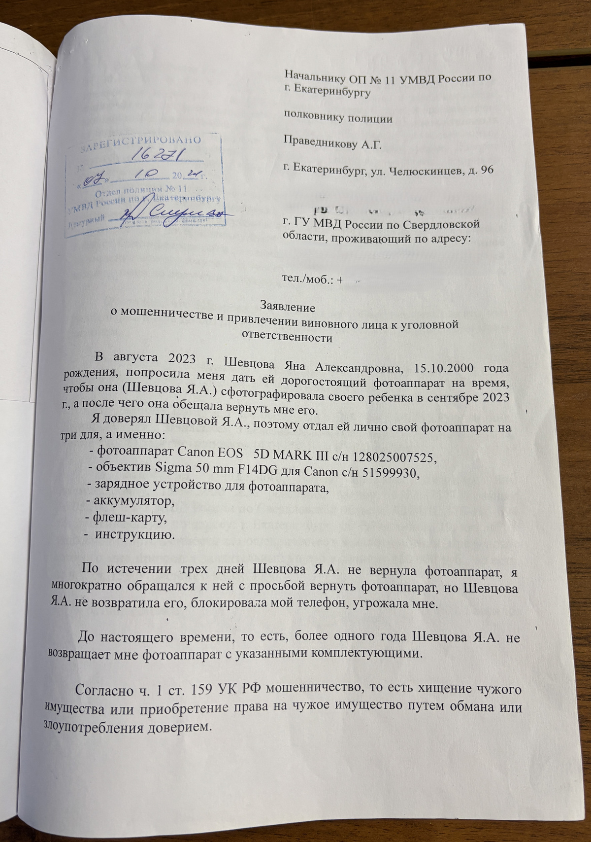 — Шевцова Я.А. блокировала номер телефона Александра, обещала вернуть фотоаппарат, но на встречи не приходила, придумывала разные истории и причины, лишь бы не возвращать имущество. Александр считает, что Шевцова вообще не собиралась возвращать ему вещь — изначально решила похитить его, злоупотребив его доверием. По оценке Александра, стоимость фотоаппарата вместе с комплектующими — 160 000 рублей, — рассказал «Моментам» адвокат Александра Игорь Упоров.