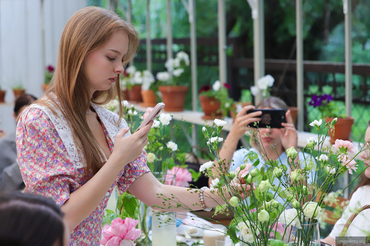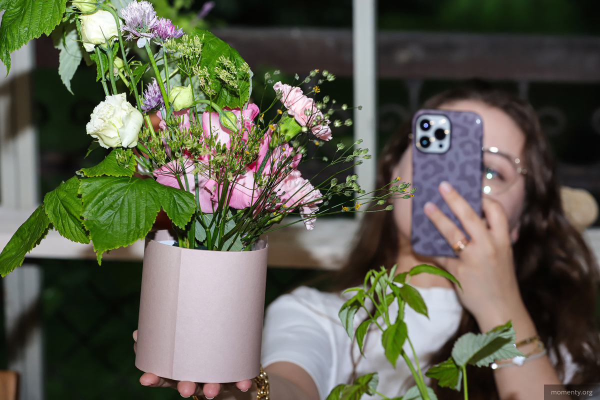 На цветочном вечере девушки собирали композиции в коробках. Мастер-класс проводила одна из основательниц BURO30 Алина Ремезова. Она решила показать, как создавать букеты в форме восьмерки. Для цветочных композиций блогеры использовали розы, диантусы, аллиум и ветви малины.