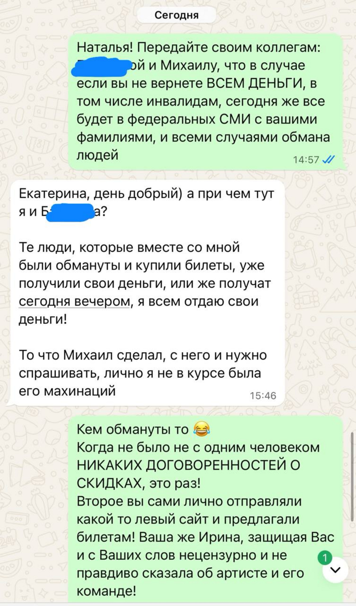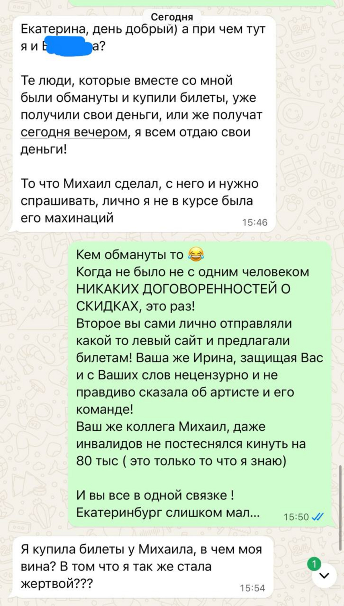 Стоимость билетов начиналась от 1000 рублей, в то время как самые дорогие места фанаты репера могли приобрести за 25 000 рублей. По словам Махневой, изначально причиной всех проблем считался пиар-агент, однако впоследствии выяснилось, что и сама рекламщица стала жертвой мошеннических схем Михаила. Кстати, ранее он также приобретал билеты у агентства Mahnevaevent. Этот момент Екатерина выяснила, когда ей предоставили контакты мошенника. В распоряжении редакции есть переписка Махневой со злоумышленниками. Их имена Махнева намеренно скрыла, чтобы дать возможность исправить ситуацию виновным.