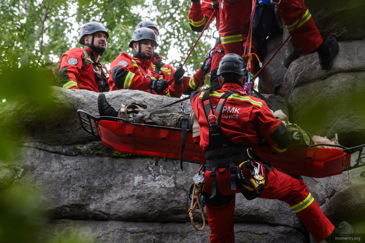 Тренировка прошла на скалах Чертово Городище. Легенда была максимально приближена к реальности: человек забрался на высоту без снаряжения, повредил руку и успел лишь сообщить примерное местоположение. Связь оборвалась, а значит, у спасателей осталась только ориентировка и время, которое всегда работает против пострадавшего.