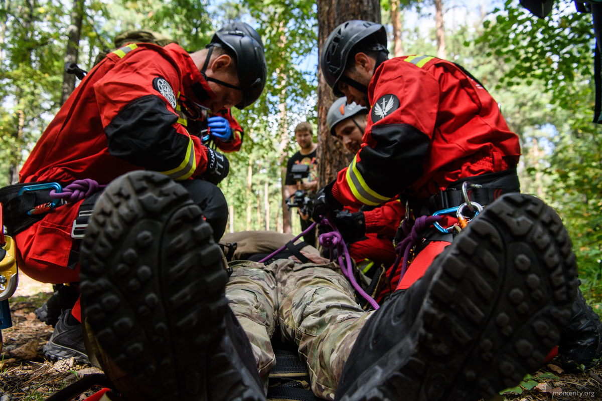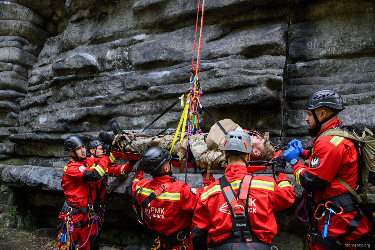 После обнаружения условного пострадавшего на место выдвинулась группа спасателей. Одни оказывали первую помощь — наложили шину на сломанную руку, другие готовили носилки и закрепляли стропы. Спуск с высоты прошел под постоянной страховкой, и вскоре спасатель с «пострадавшим» были уже внизу. Дальнейший маршрут зависел бы от тяжести травмы: при легких повреждениях пострадавшего увозят на квадроцикле, при более серьезных — доставляют прямо до машины на носилках.