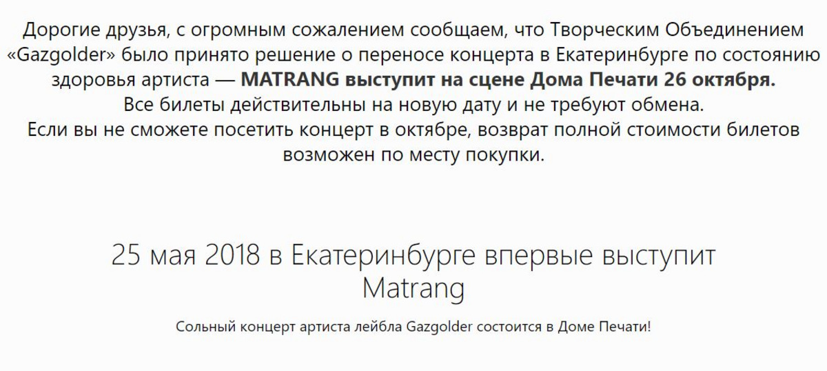 «Дорогие друзья, с огромным сожалением сообщаем, что Творческим Объединением „Gazgolder“ было принято решение о переносе концерта в Екатеринбурге по состоянию здоровья артиста — MATRANG выступит на сцене Дома Печати 26 октября».