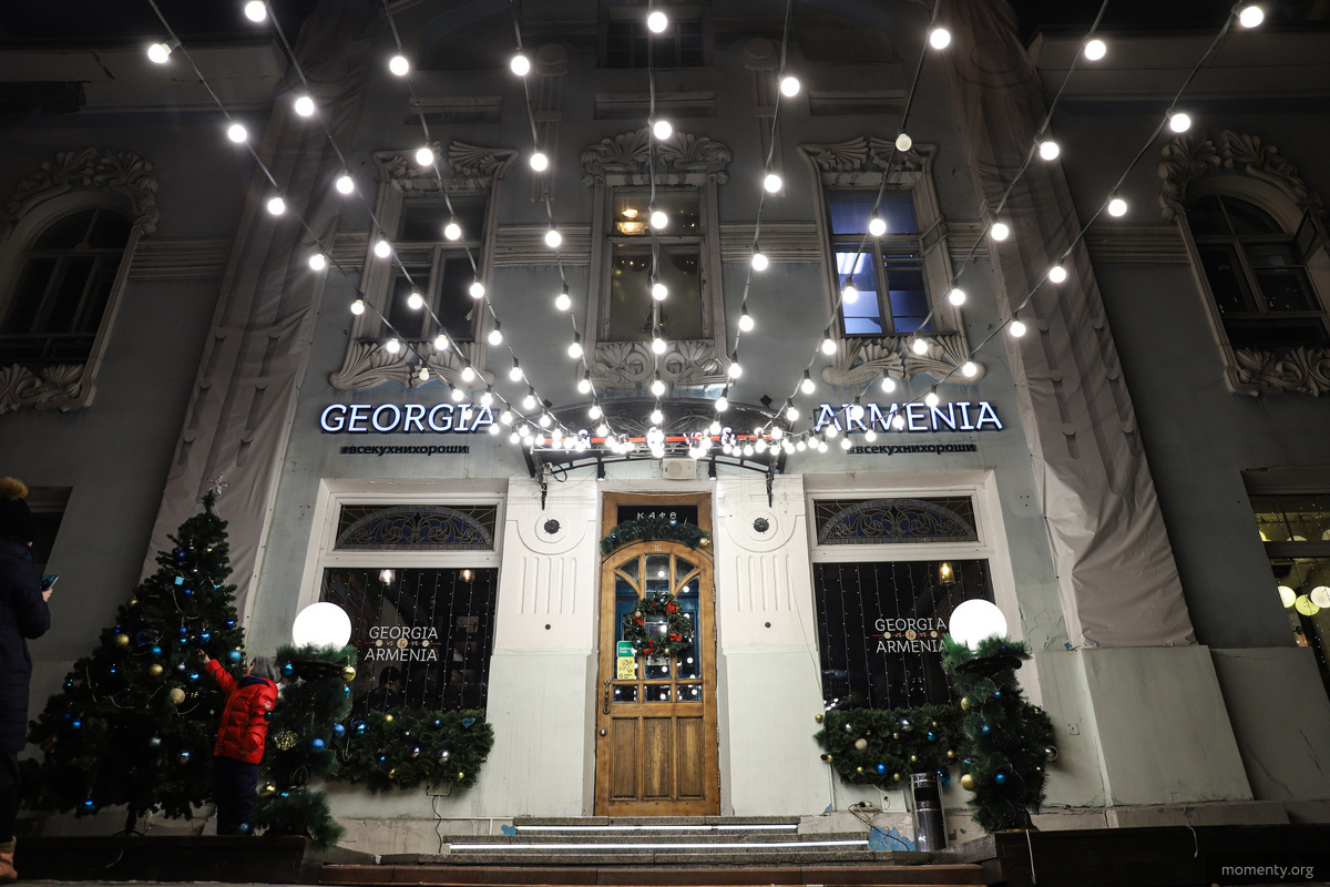 Из заведений нельзя не отметить ресторан «Итальянцы». Вся входная группа украшена хвойными гирляндами и контрастными, красными шарами. Бистро «Горожане» также украсили окна и каркас пушистыми хвойными гирляндами, из-за которых не видно даже вывески с названием. Рядом с «Сойкой» поставили необычную инсталляцию из елей.