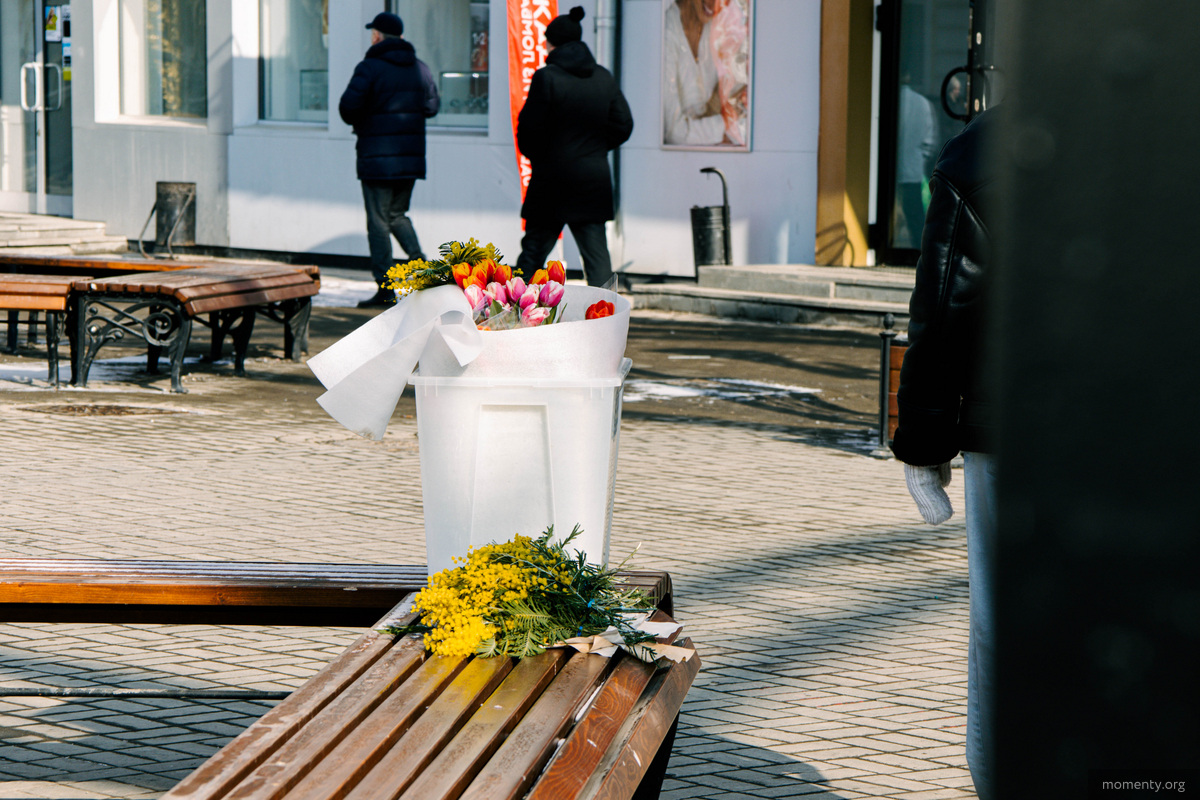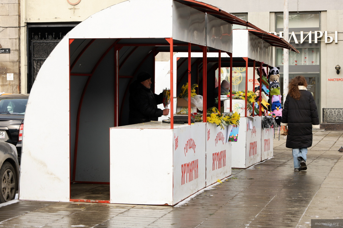 Возле закрывшегося концепт-стора Brand House открылась праздничная ярмарка, приуроченная к 8 Марта. На Площади 1905 года предлагают букеты и аксессуары ручной работы.