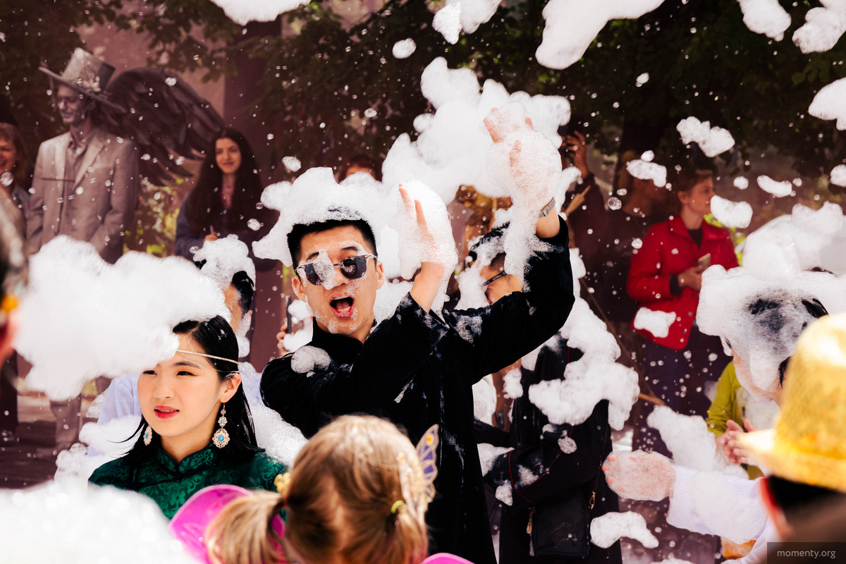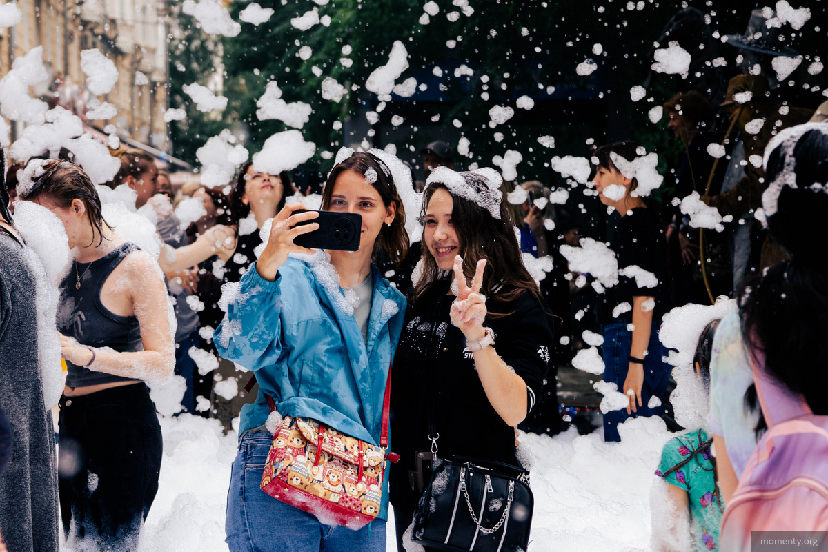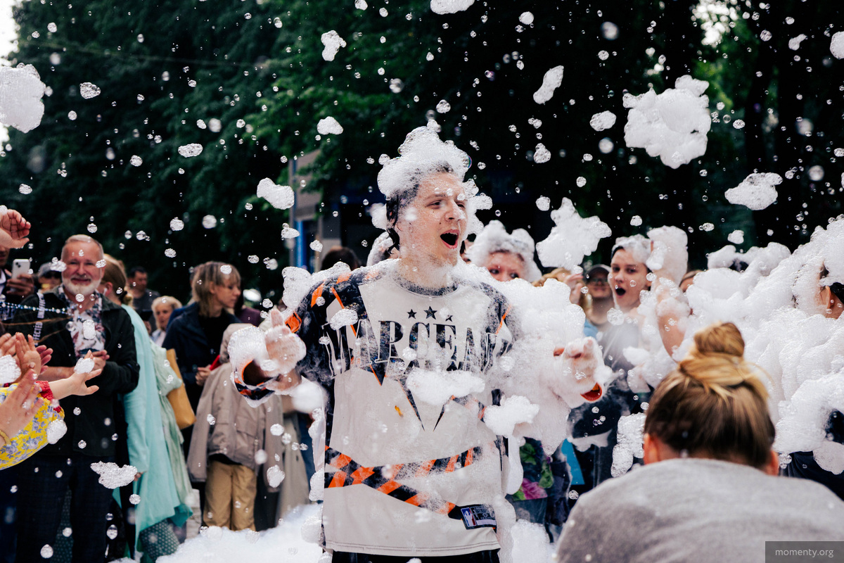 Тротуары около главного корпуса УрФУ затопило пеной. Все потому, что в Екатеринбурге стартовал 18-й фестиваль «Коляда-Plays». Прямо у входа в «Коляда-театр» прошла традиционная пенная вечеринка — горожане смогли погрузиться в творческий хаос с живыми статуями, красками, плясками и фейерверком из пены.