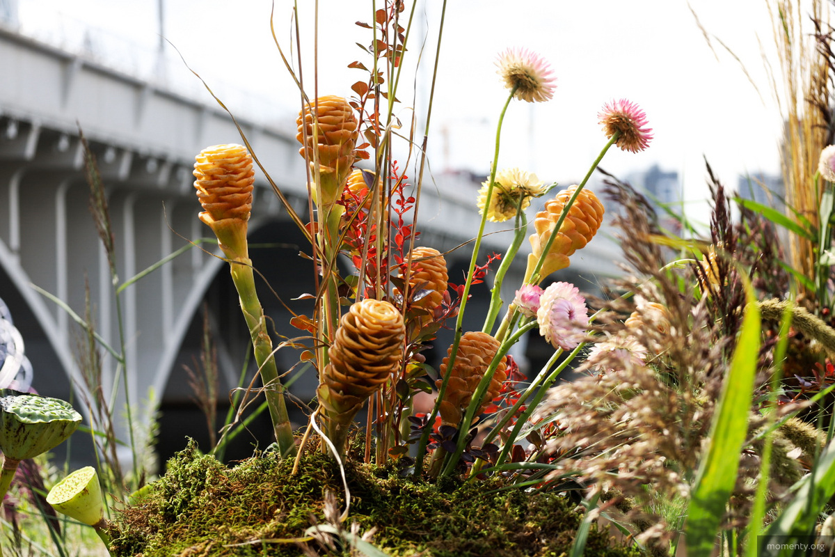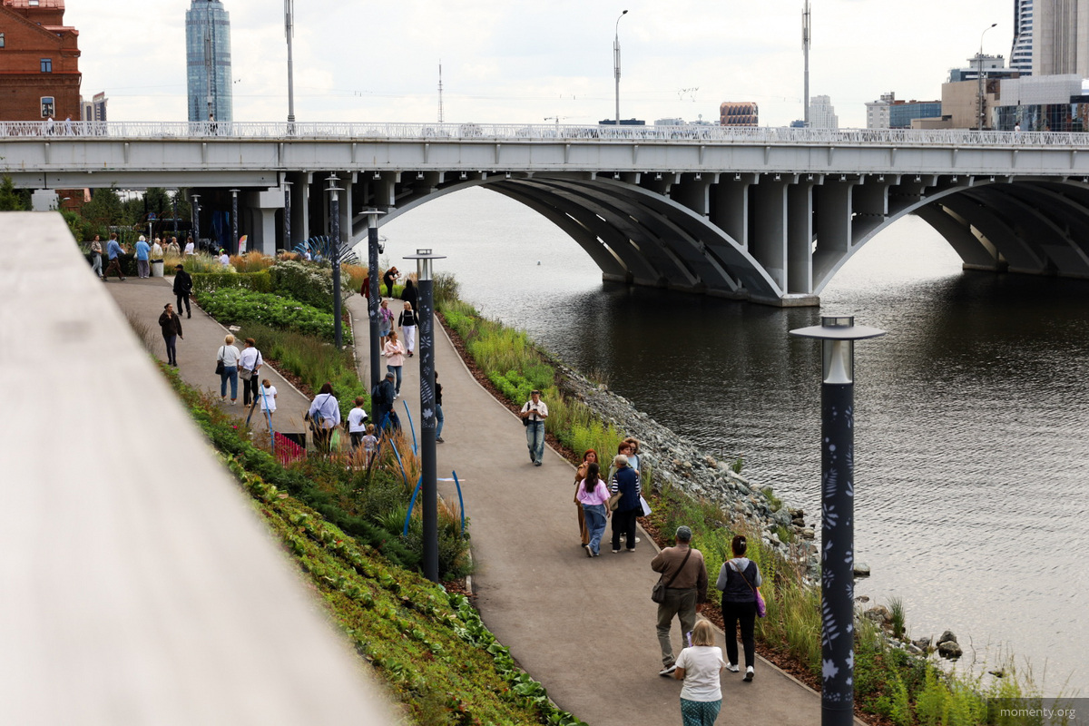 Затем случилось грандиозное событие: зеленый оазис в центре Екатеринбурга засиял обилием цветущих растений. Набережная за Макаровским мостом вновь преобразилась — здесь в седьмой раз открылся фестиваль ландшафтного искусства «Атмофест».