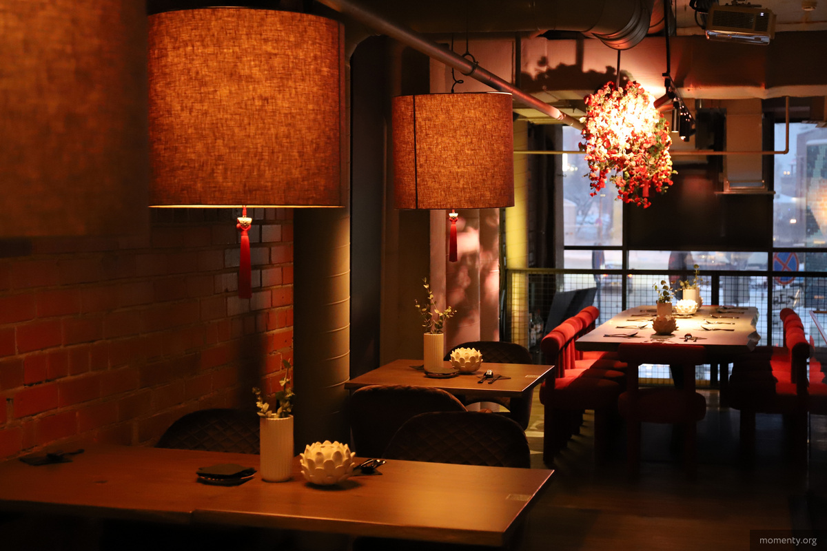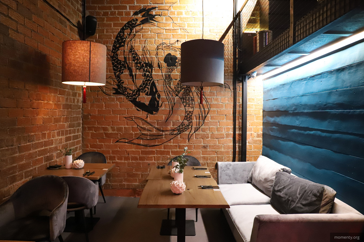 Шеф-повар ресторана прошел стажировку во Франции. Дизайн заведения старались сделать схожим на дизайн японских баров, некоторые элементы декора привезены из Китая, например статуя на входе, расписные раковины. К красной статуэтке на входной зоне вскоре добавится и ванна, наполненная водой, чтобы гости смогли кидать в нее монетки, как это принято в азиатских странах.