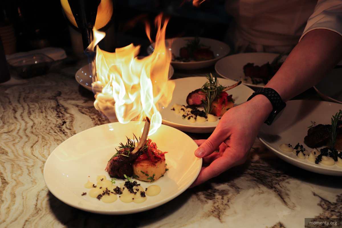 Следующим курсом становится каре молодого барана с картофелем конфит и черной икрой белуги. Для Никиты Кузьменко сочетание мяса и черной икры стало необычным экспериментом. Гостей сразу предупреждают: пробовать нужно быстро, чтобы вкус был максимально насыщенным. Картофель обжаривают прямо перед тем, как подать на стол.