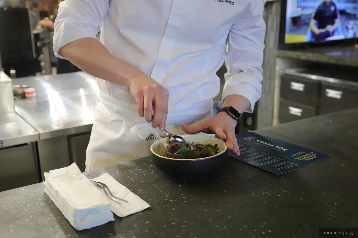 — Морских ежей везут сюда прямо к ужину, они не успеют даже немного полежать в холодильнике. В реальном времени начнем их разделывать, рейс, который их вез немного задержался, — делится с «Моментами» шеф Norra rök Никита Кузьменко.