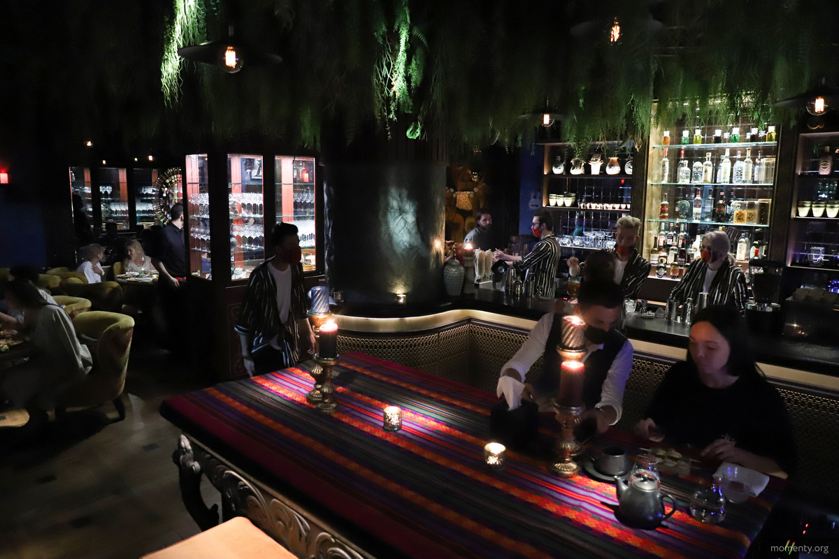 Бармены изакайи за белоснежной стойкой будут наливать летние коктейли, в том числе фирменный «Сакурамба-спритц» с вишней и клубникой.