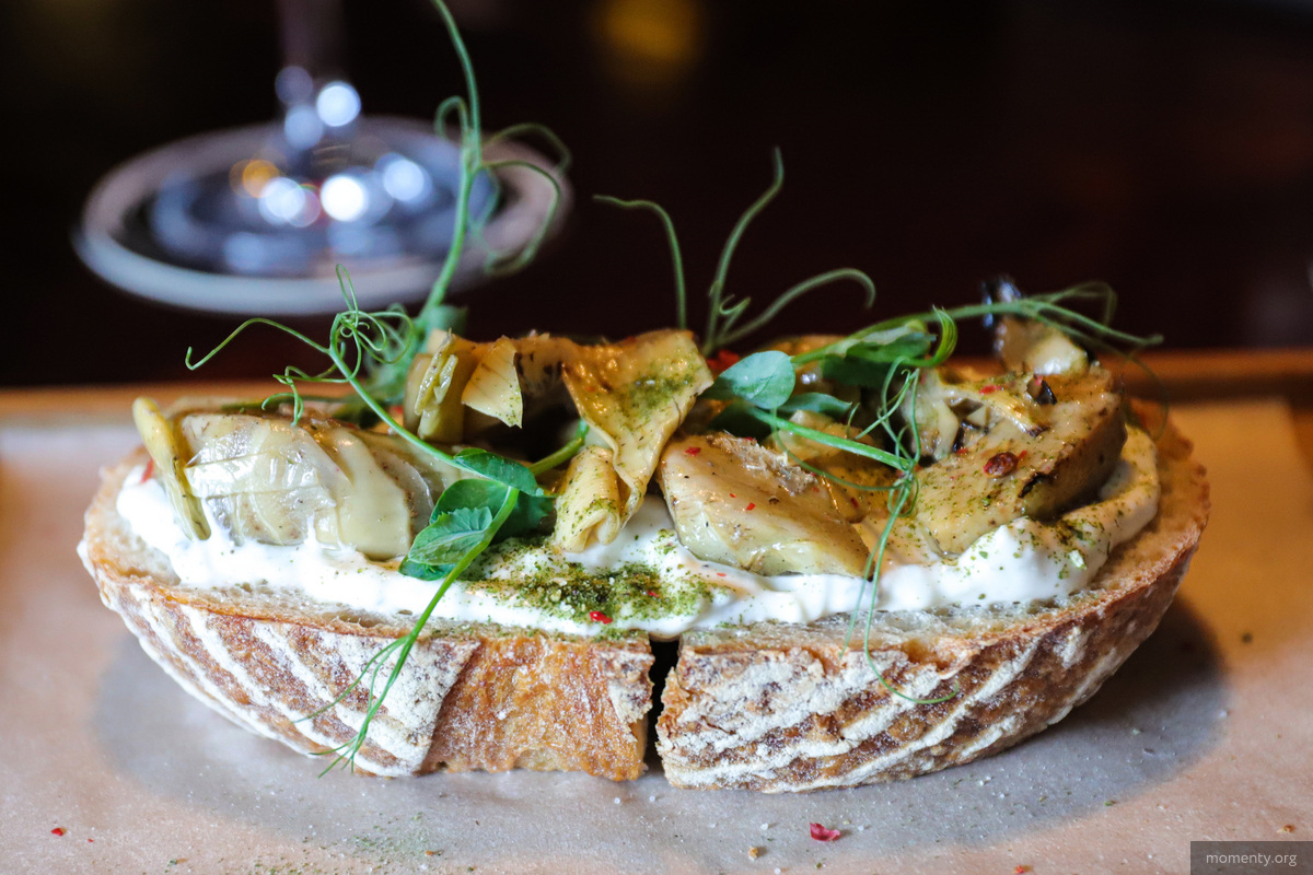 Брускетта с кремом из горгонзолы, маринованными артишоками гриль на ремесленном хлебе. Шеф умоляет, ешьте- руками.