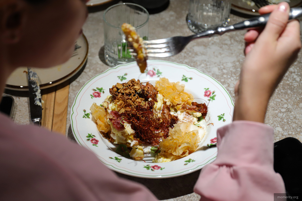 — Слоеную лепешку роти, пожаренную на топленом масле с говяжьей грудинкой, ким чи, маринованным огурцом, редисом, копченым мисо майонезом и свежим шпинатом.