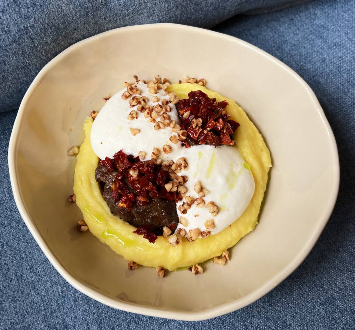 — Телячьи щечки с сырным муссом и вялеными томатами;