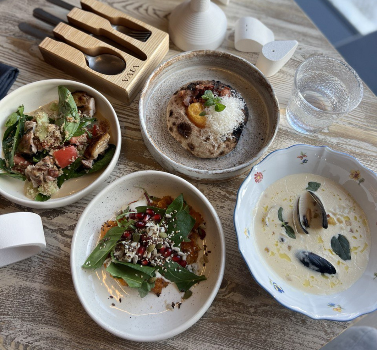 — Пате из омуля на медовом багете, вафля из кабачка и пармезана со страчателлой плюс отличное белое из Риохи Medusa Albarino;