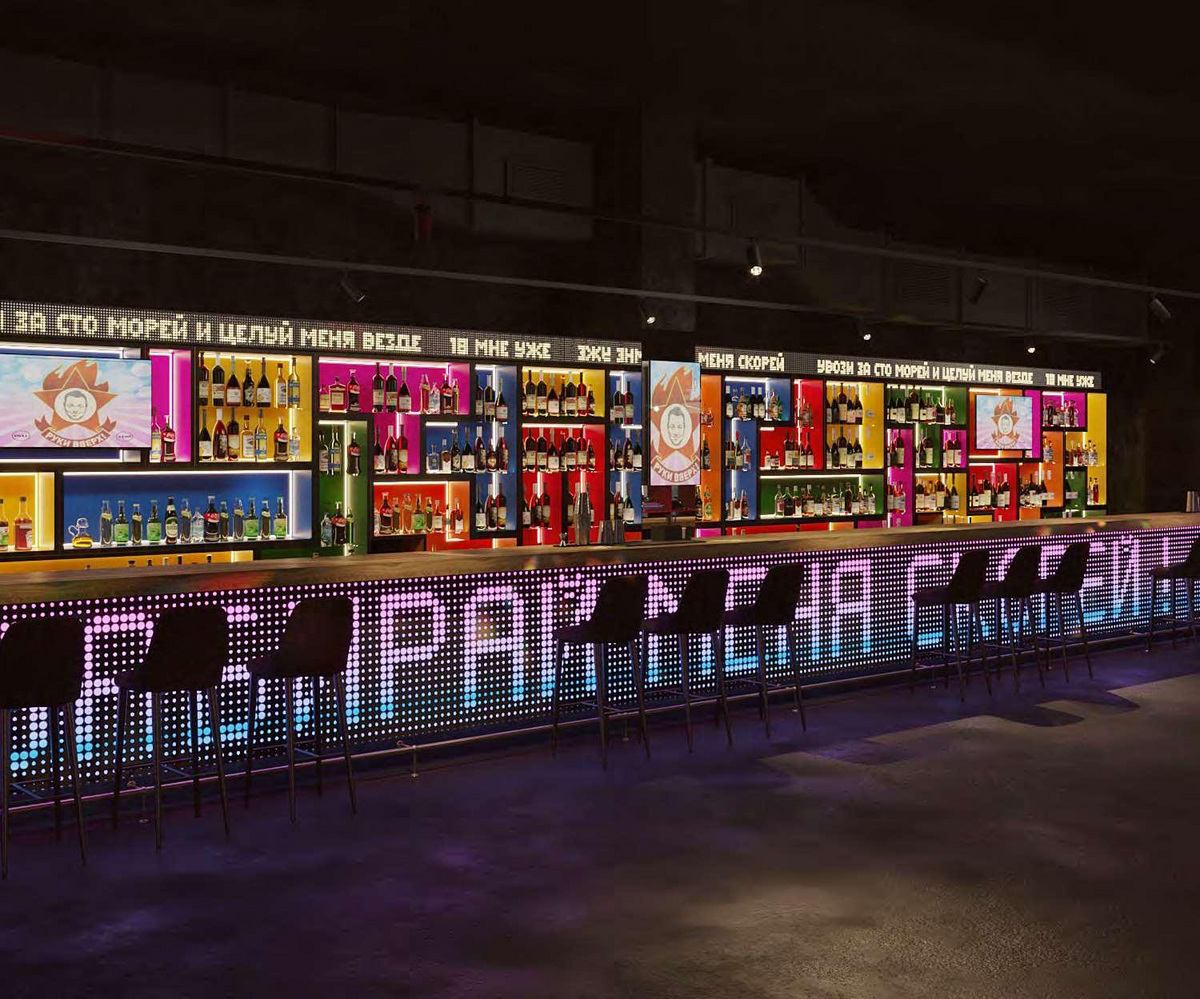 Заведение от участника легендарной группы будет разделено на несколько тематических зон: караоке, лаунж, танцпол, бар. Отличительной чертой «Руки Вверх! Бара» станет гигантский танцпол с раздвижной стеной. Там одновременно смогут находиться более тысячи посетителей. Интерьер будет выдержан в стилистике 90-х: ковры и плакаты со звездами на стенах, магнитофонные кассеты и игры в «Тетрис».