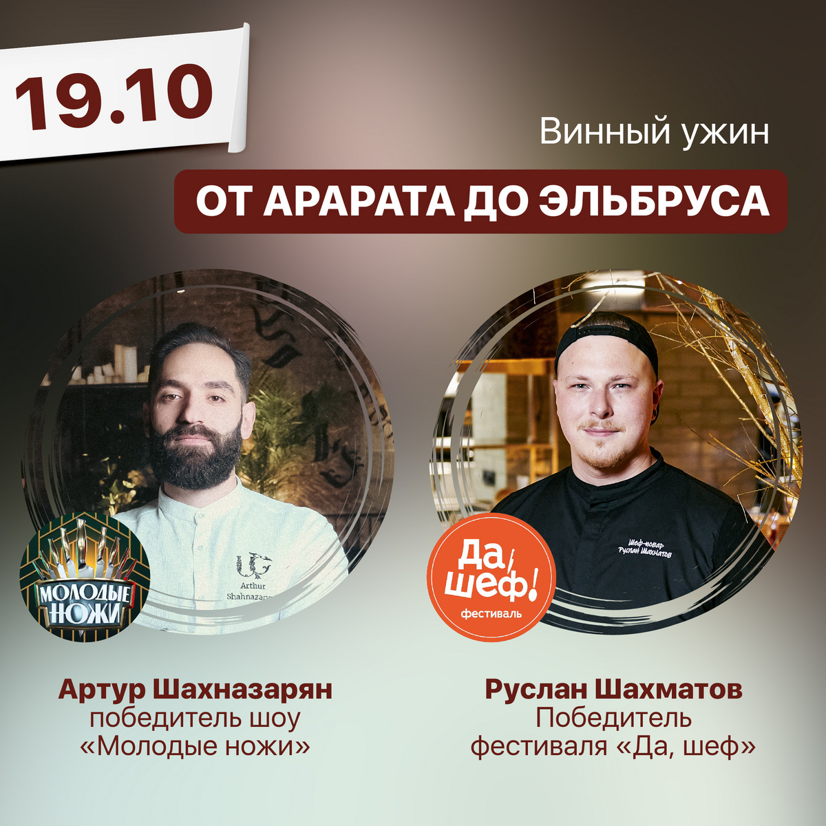 Шеф-повар Артур Шахназарян, победитель проекта «Молодые ножи», основатель движения новой армянской кухни и шеф-повар ресторана «Высота 5642» Руслан Шахматов, победитель фестиваля «Да, шеф» от Константина Ивлева устроят грандиозный ужин в четыре руки. Назвали гастрособытие «от Арарата до Эльбруса». В меню ужина: