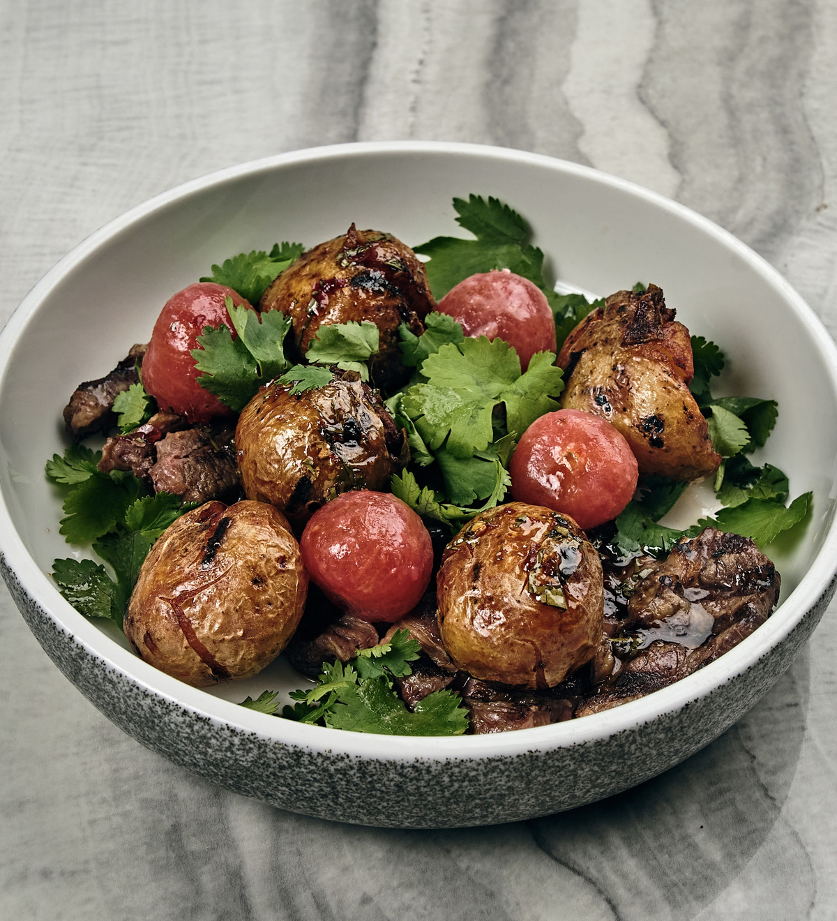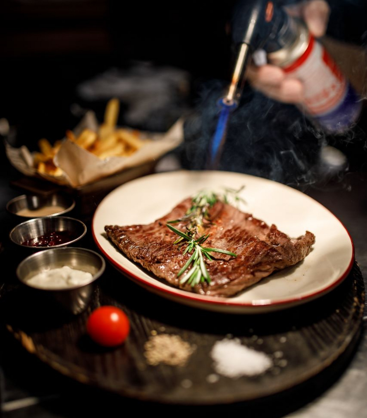 — Стейк Рибай, приготовленный на огне с соусом на основе сладкого чили и кинзы, копчеными томатами черри и поджаренным мини картофелем;