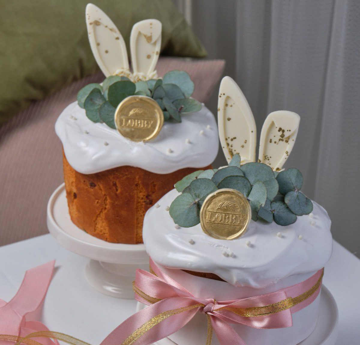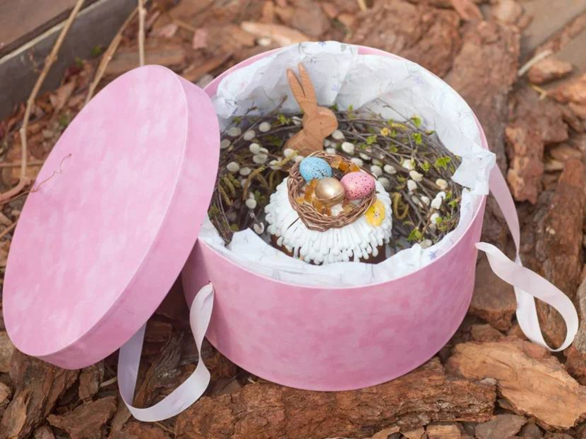 В этом году, чтобы сделать упаковку для своей выпечки, ресторан сколлаборировался с цветочным бутиком Theatre of flowers. Получились желтые и розовые бархатные коробки с венком из вербы. А вот внутри самого кулича оказались темный шоколад, пекан, ром и цукаты. Украсили его шоколадными яйцами с фундуком.