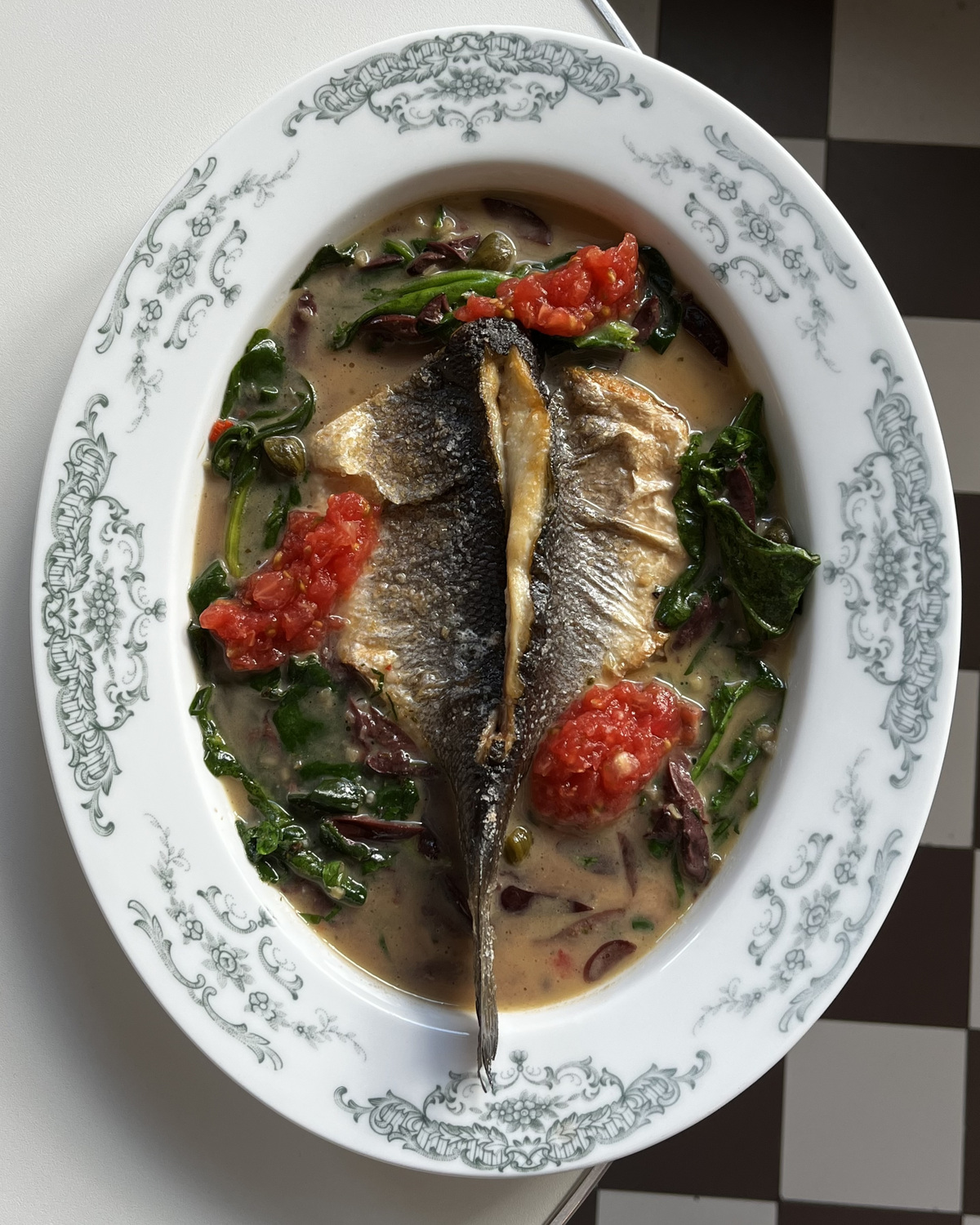 — Сибас с оливками, шпинатом и соусом из белого вина;