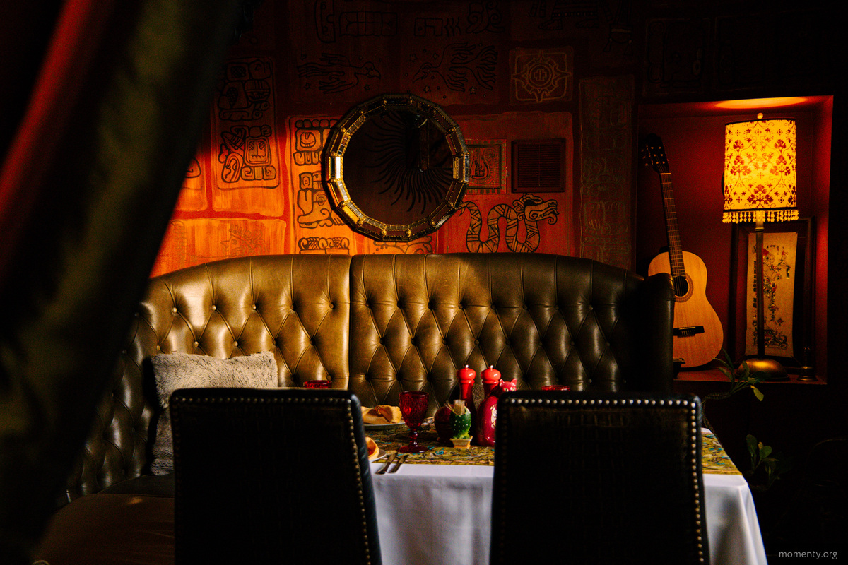 На первом этаже нас встречает бар в латинском стиле под названием «Конкиста». Яркие сомбреро украшают стены, а аутентичная стойка приглашает попробовать разнообразные напитки и насладиться любимыми телешоу. Рядом расположена красная комната — камерное пространство, идеально подходящее для дружеских встреч или романтических ужинов. Также здесь есть малый зал в колониальном стиле, рассчитанный на торжества для 10-17 человек. Изящные подсвечники, фактурные обои, настенные светильники и резной шкаф — здесь невольно начинаешь чувствовать себя персонажем романов Шарлотты Бронте и Маргарет Митчелл.