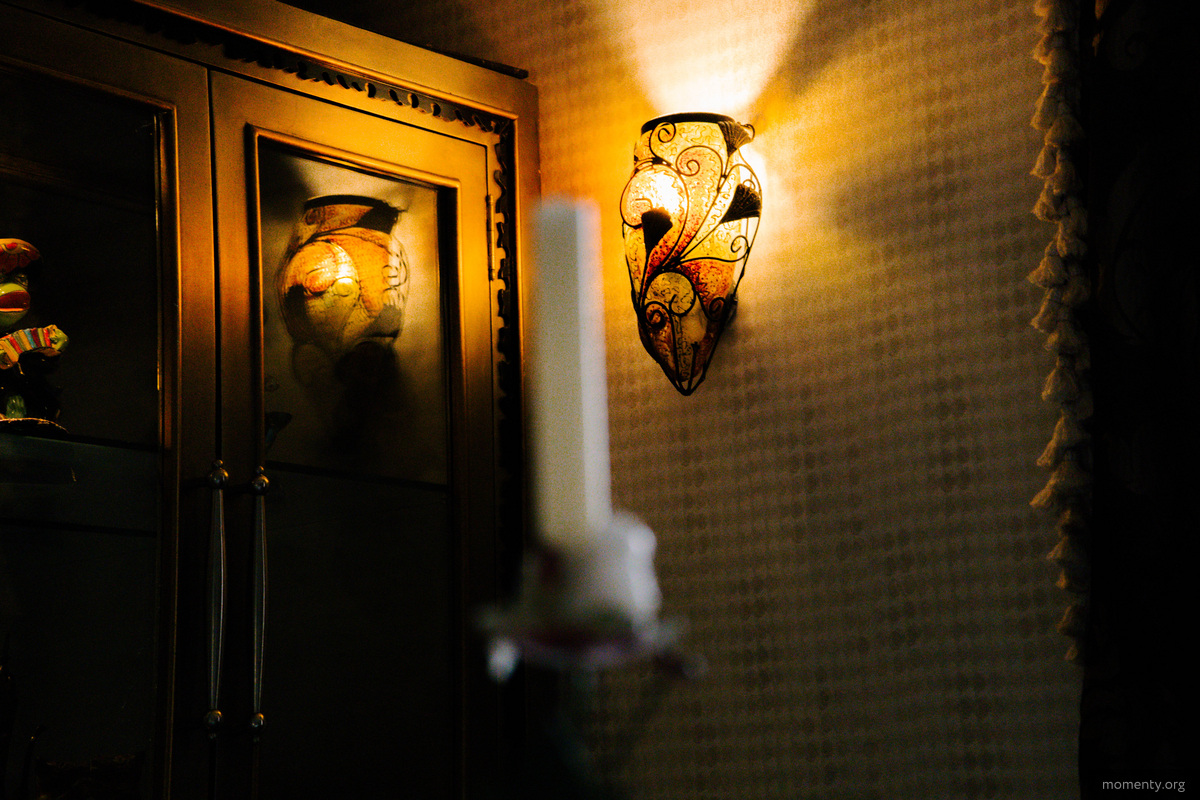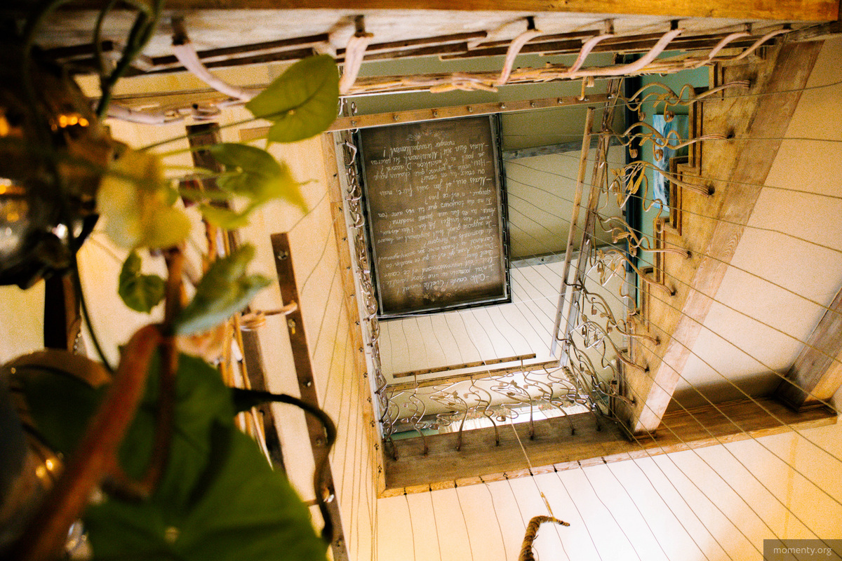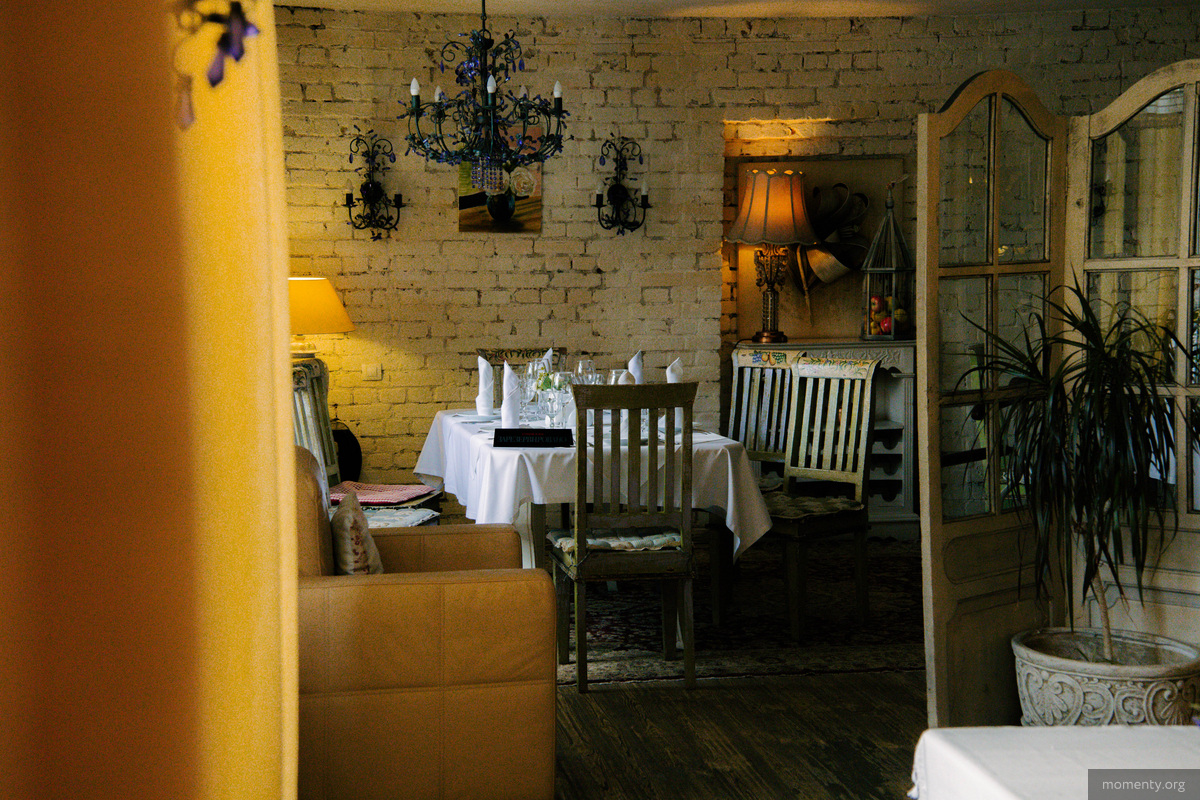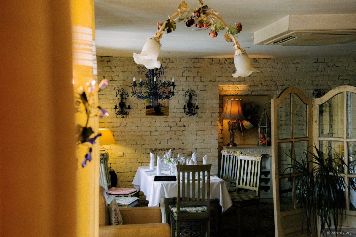 Поднимаемся выше по винтажной деревянной лестнице. Кстати, пол здесь заслуживает отдельного внимания — он старинный и сделан из дуба. По пути натыкаемся на черно-белые фотографии с намеком на «Мулен Руж», которые предвещают французскую стилистику второго этажа. И действительно: стены из белого кирпича, обилие ковров, кованые люстры, столетние зеркала и лаванда на столах создают прованскую атмосферу.