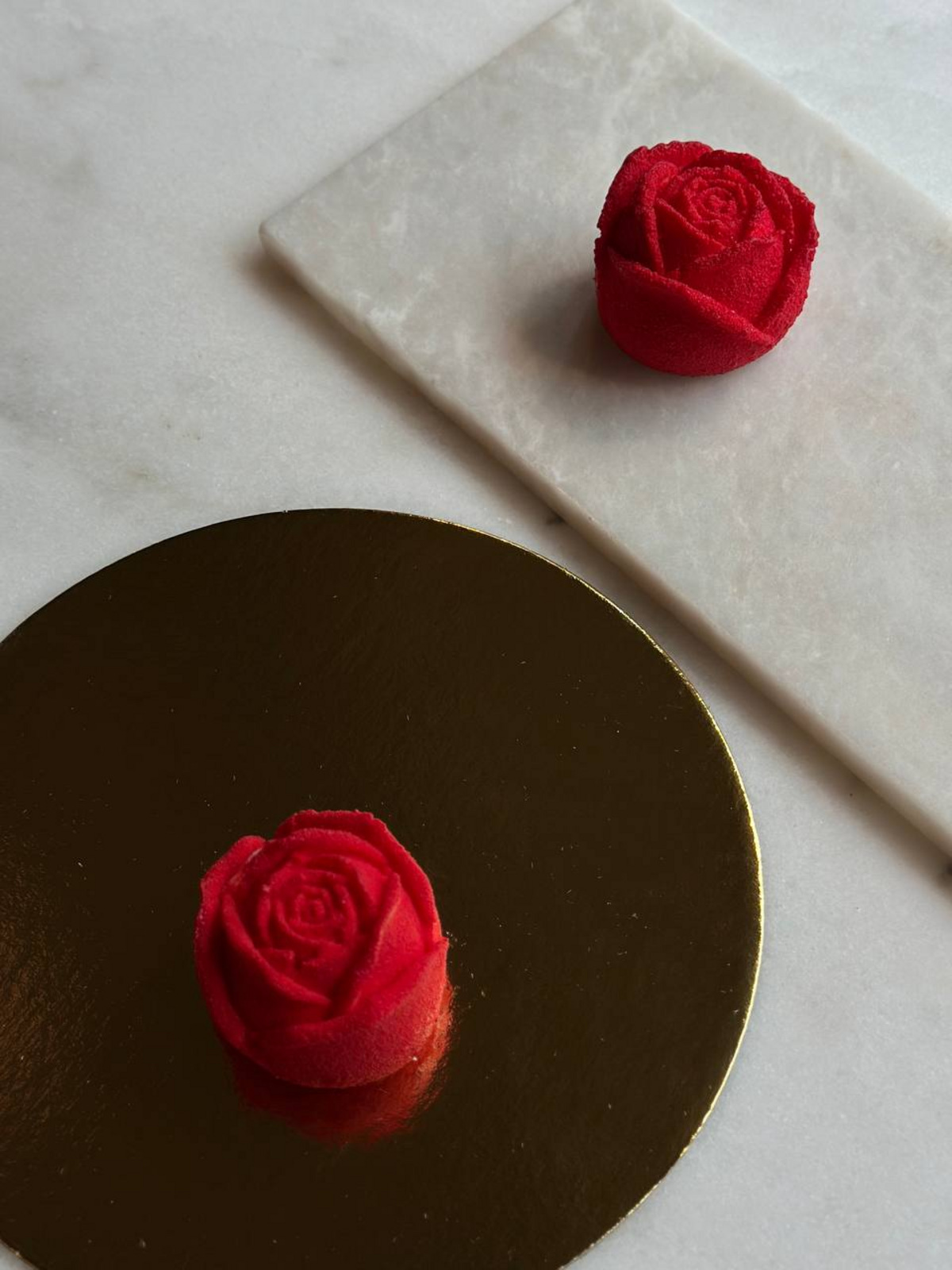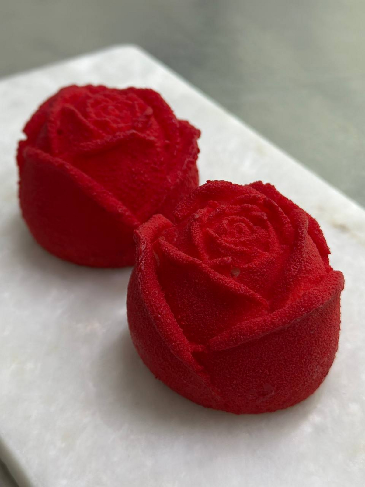 В этом заведении влюбленные сердца собираются кормить красными розами. В составе муссового пирожного — личи, клубника и роза.