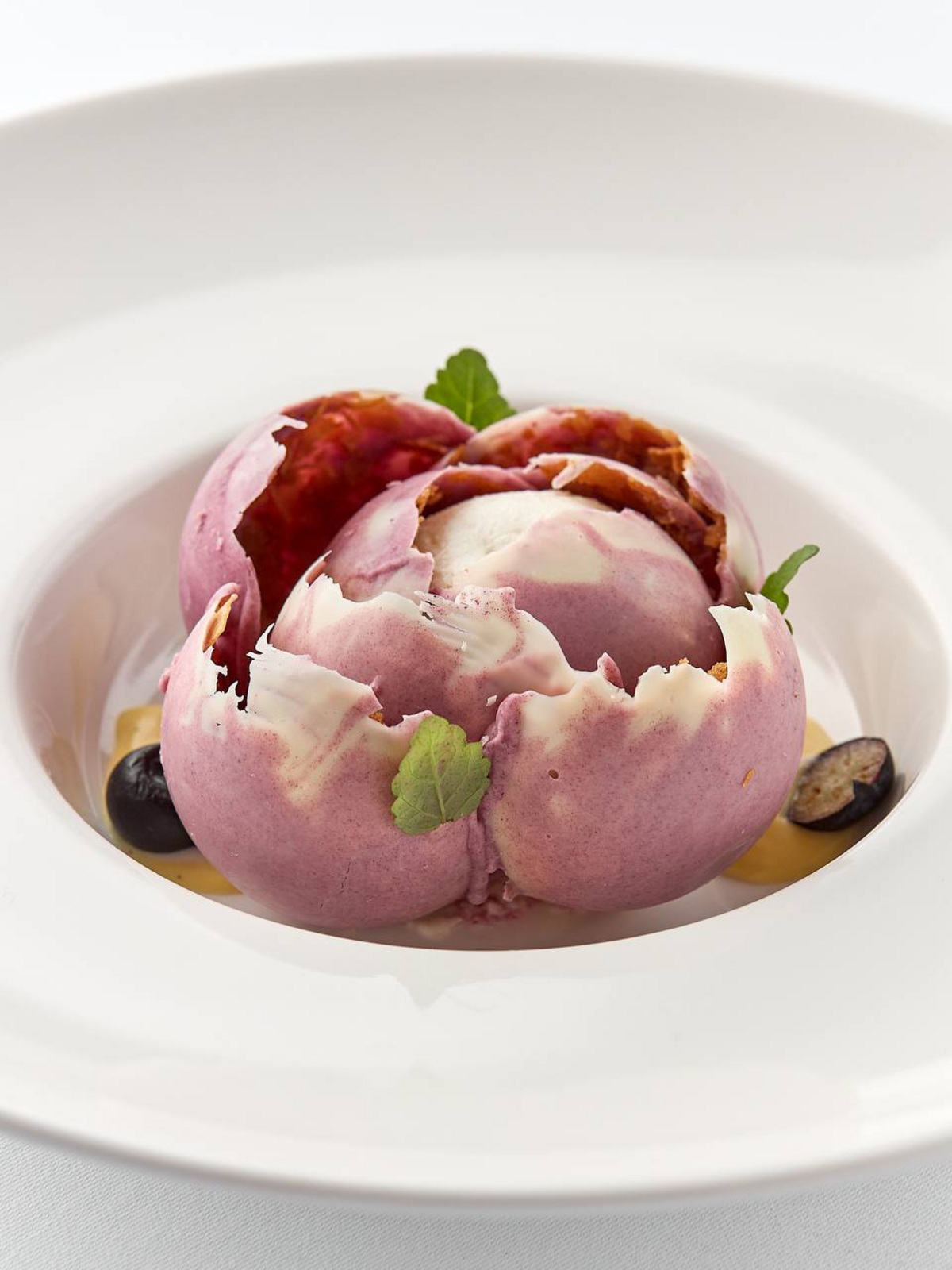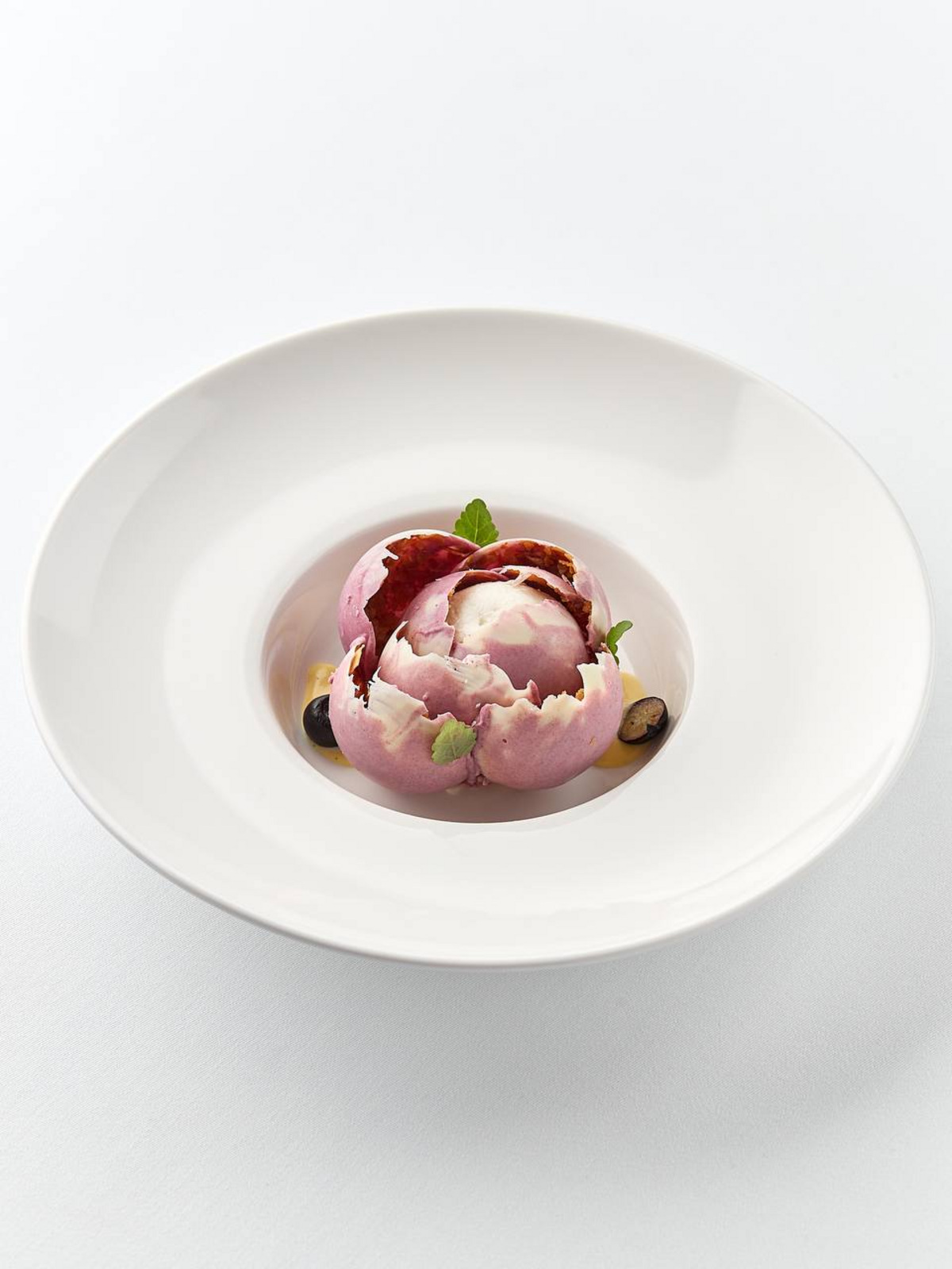 Пирожное «Пион» — это нежные лепестки из белого шоколада с йогуртовым муссом, гелем из базилика, вафельной крошкой, свежей голубикой и соусом из шафрана.