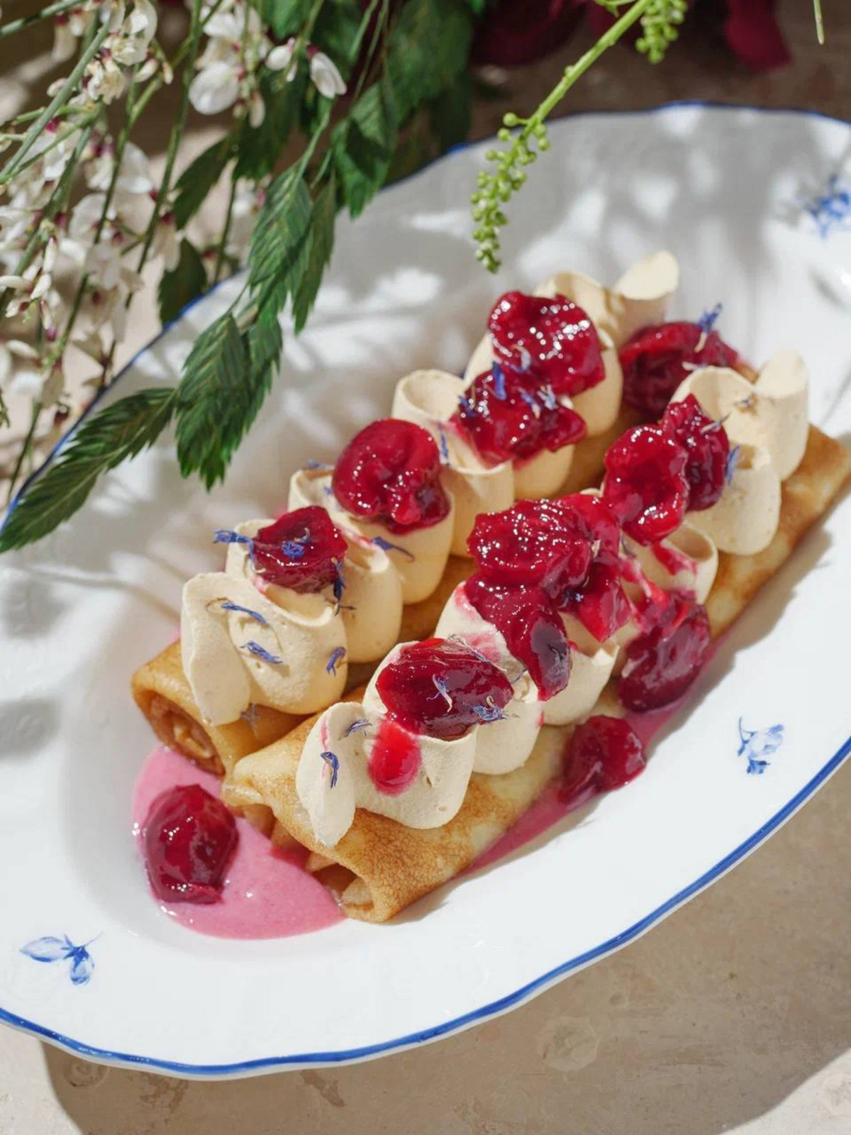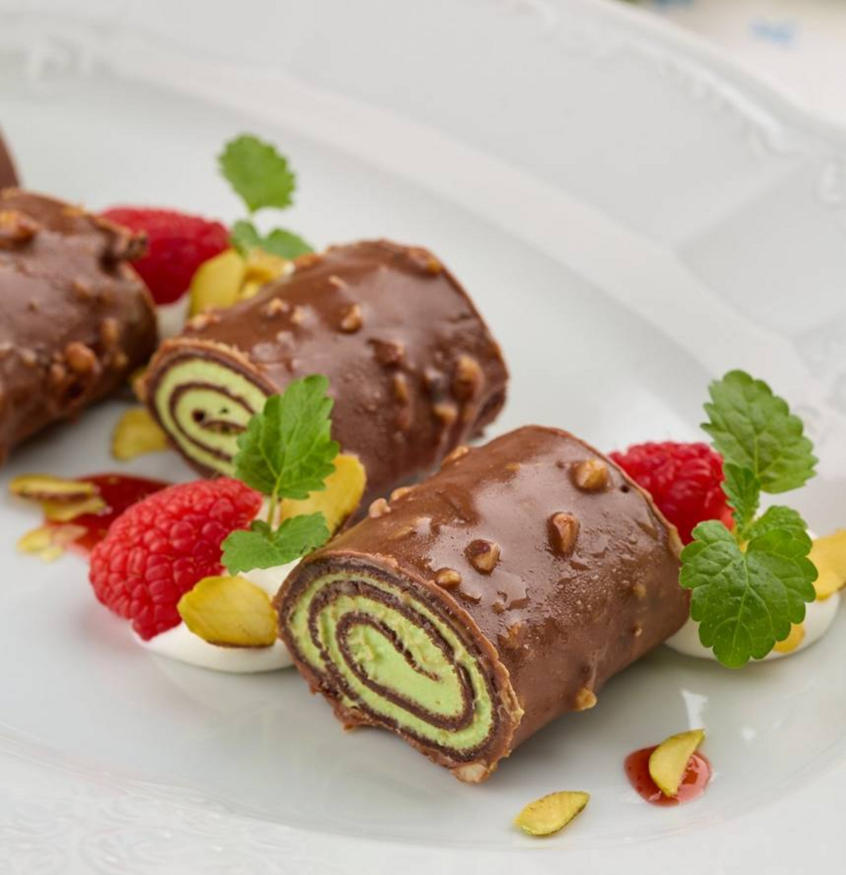 — Блинчики с шоколадным муссом и фисташковым соусом.