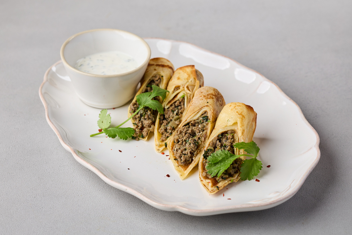 — Армянские мясные блины с перечной мятой и соусом мацони;