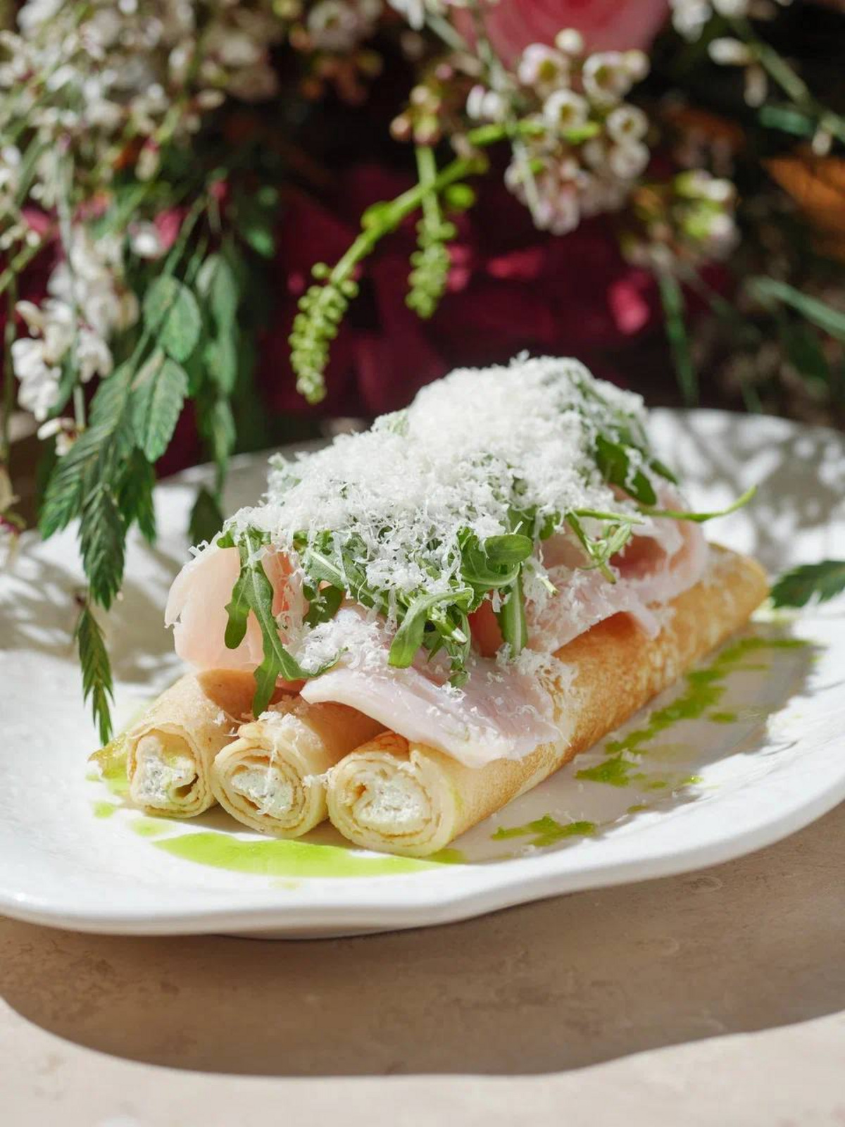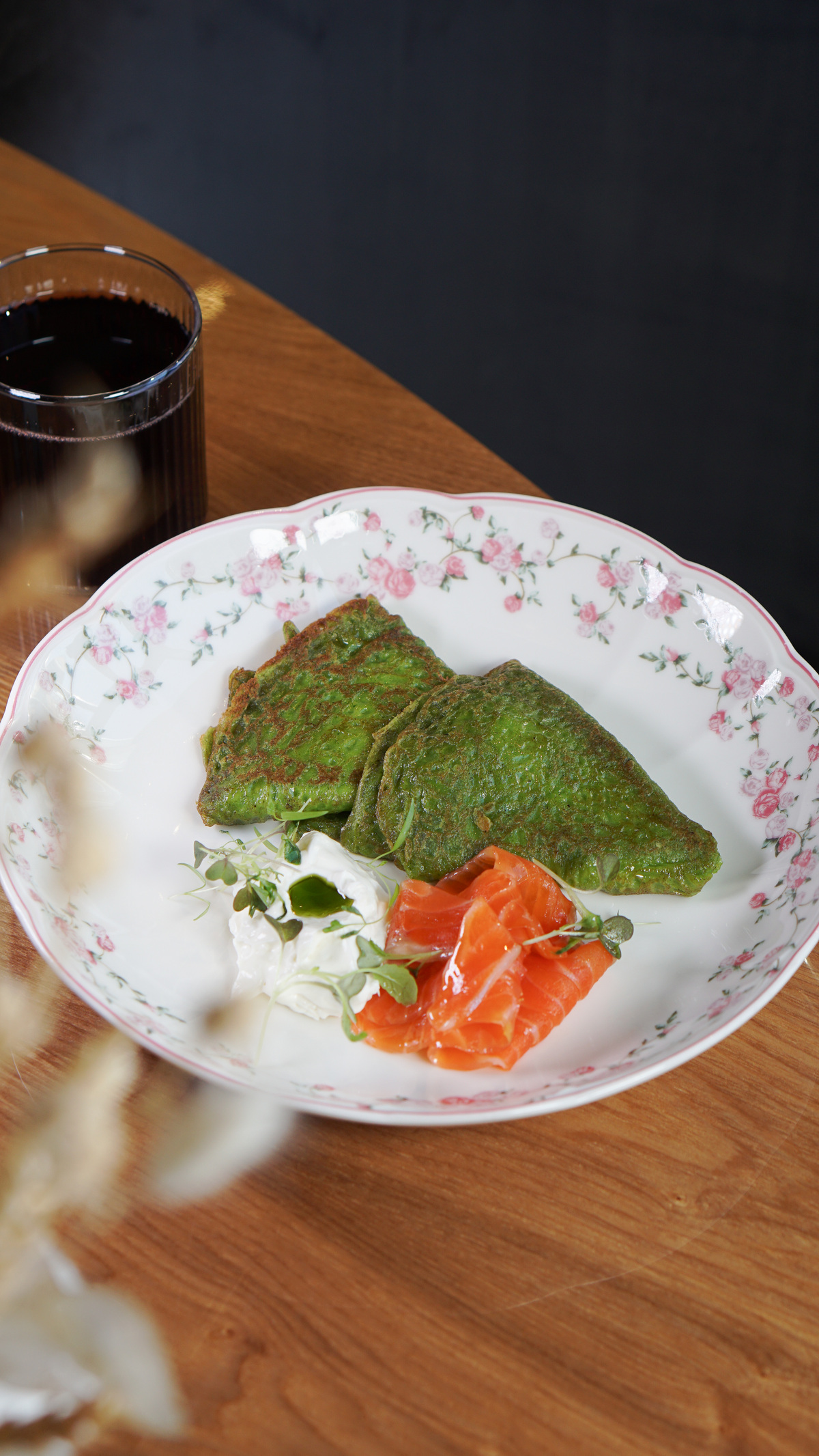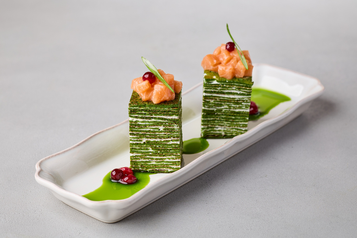 Шеф семейного ресторана радует гостей специальным блюдом в честь праздника. В меню: шпинатные блины со свежей форелью и творожным сыром.