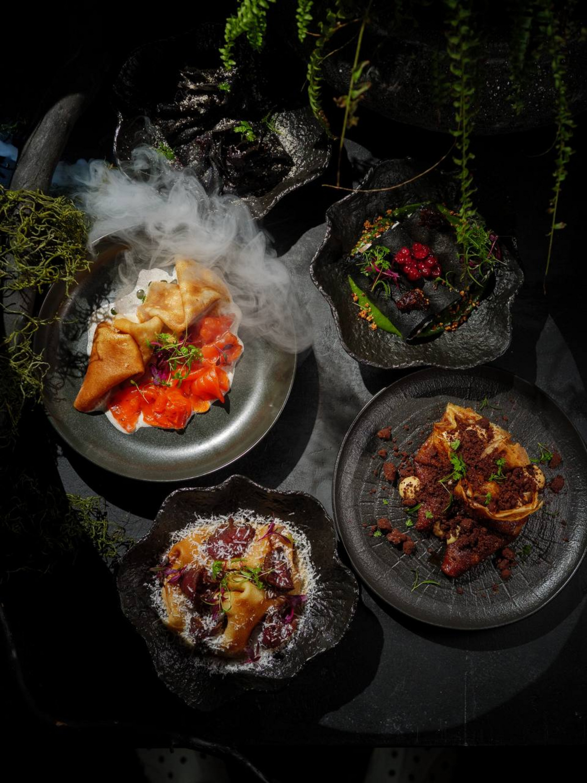 — Блины с мятым картофелем, пепперони и грибным муссом;