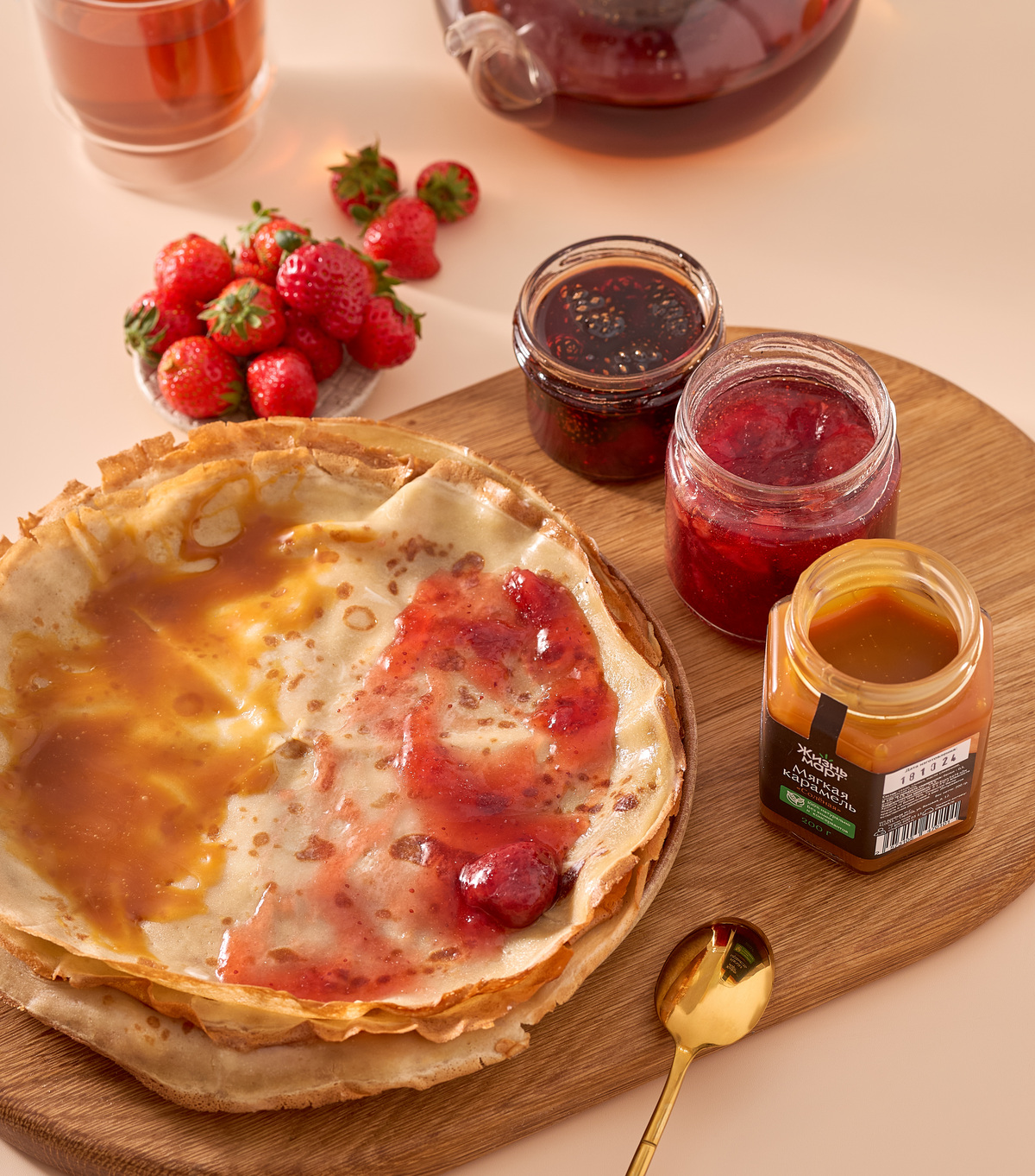— Блинчики классические с добавками (семга, красная икра, вишневый или клубничный соус, сметана, молоко сгущенное).