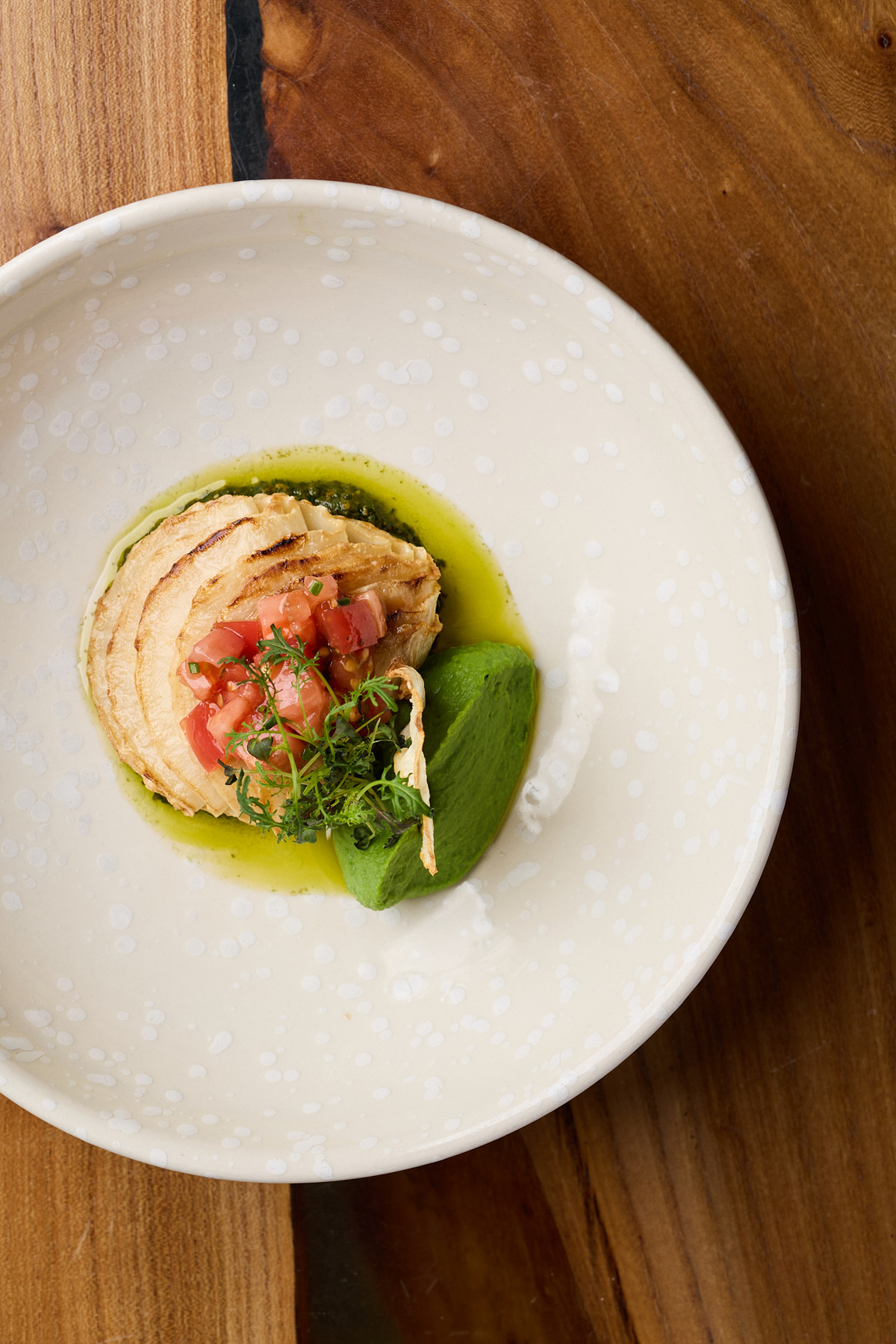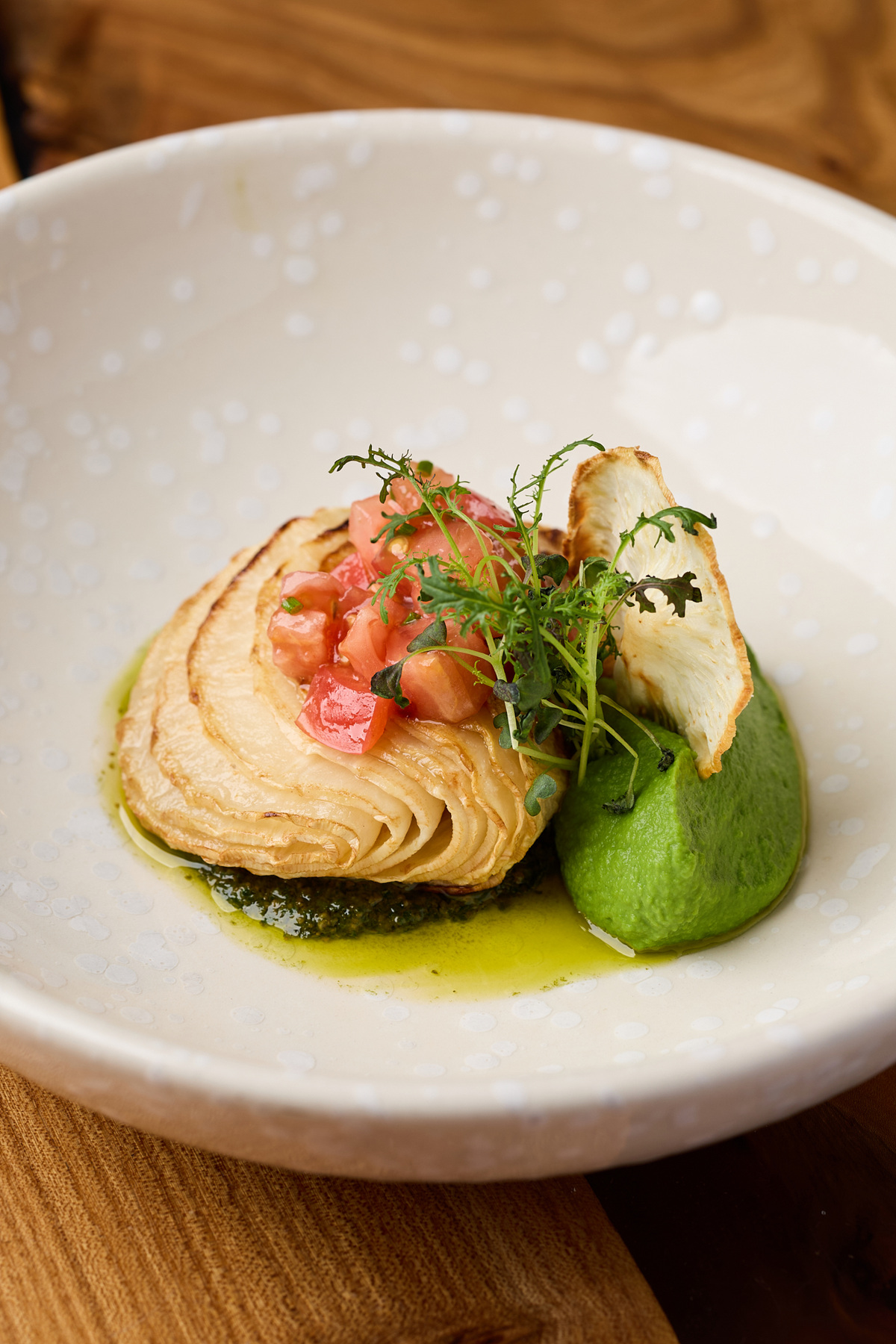 В ресторане появилась новая фотогеничная закуска — запеченный корень сельдерея, который нарезается тонкими слайсами. Подают его с пюре из зеленого горошка и постным соусом Песто.