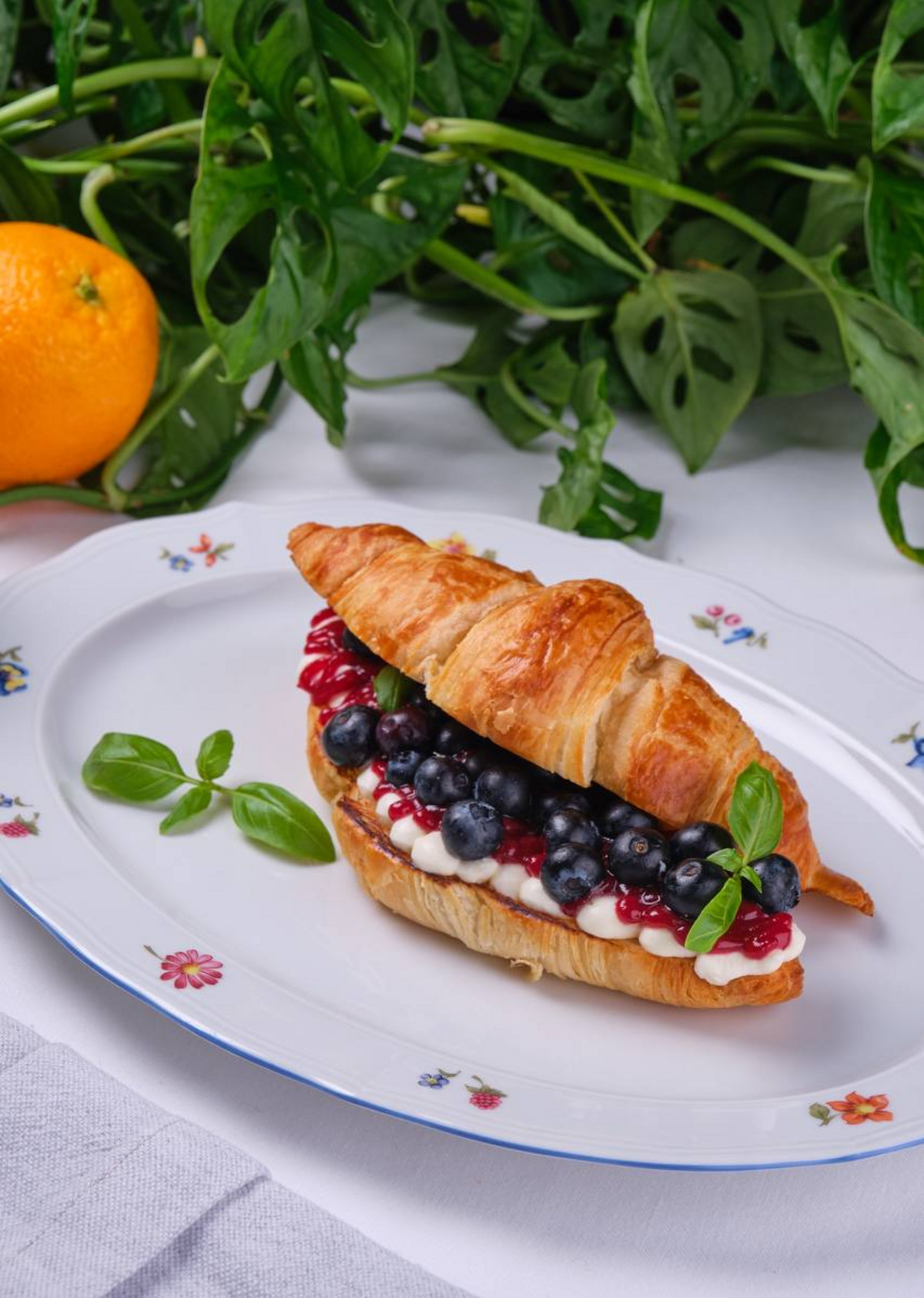 — Круассан с ванильным кремом, малиновым кули и свежей голубикой;