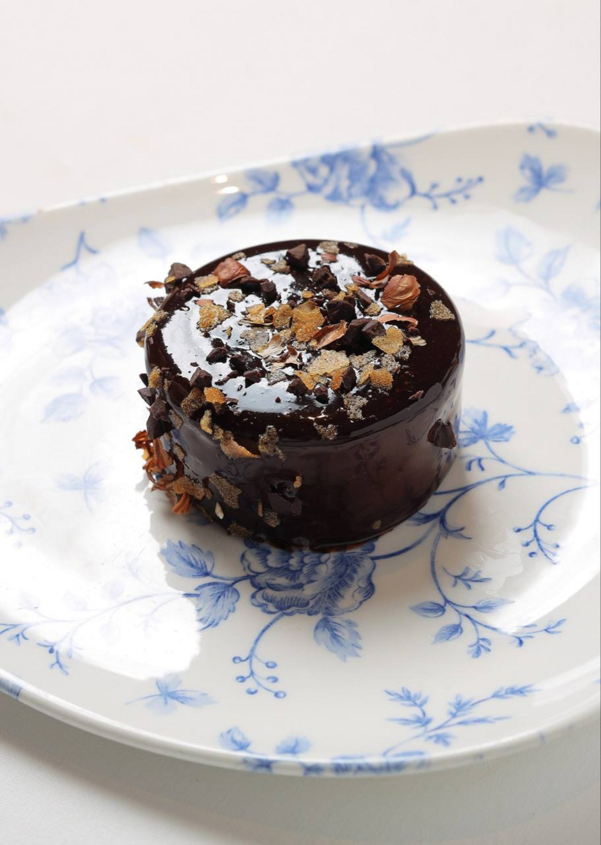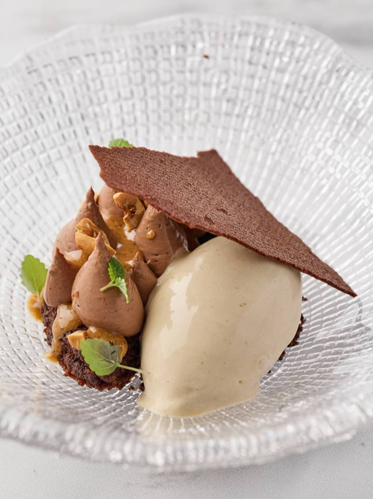— Шоколадный брауни с трюфельным ганашем, фундуковым пралине и мороженым с белыми грибами.