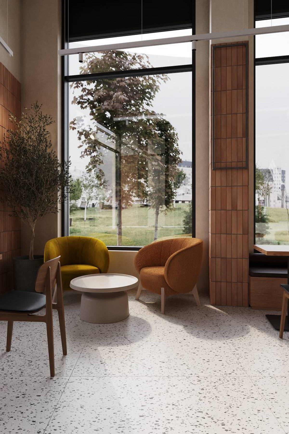 Интерьер новой кофейни Сергея Мокренко разработала команда Process Interiors. Основной акцент в оформлении заведения сделан на природные оттенки и элементы из натурального дерева. Главной задачей дизайнеров было создать ощущение простора и воздушности, поэтому в помещении достаточно окон и светлый интерьер.