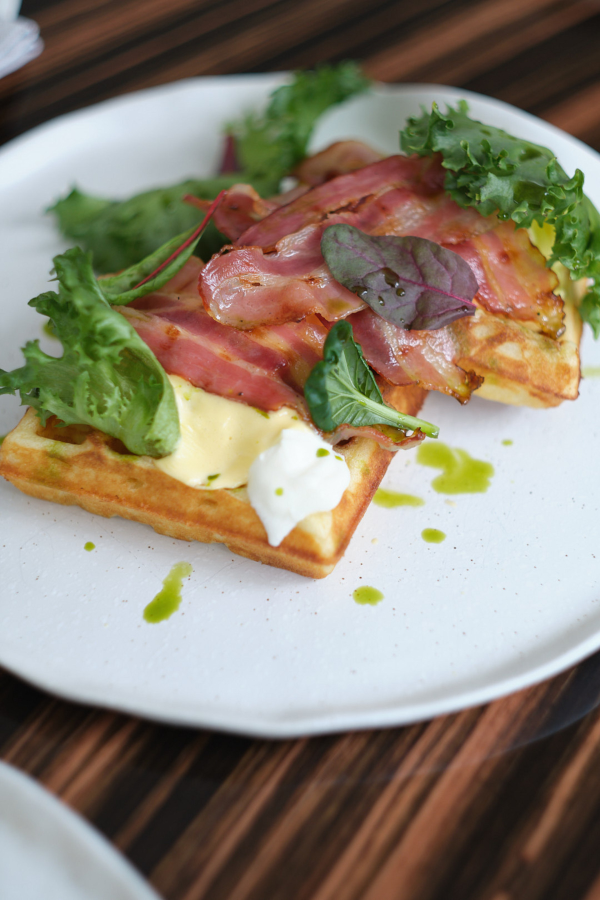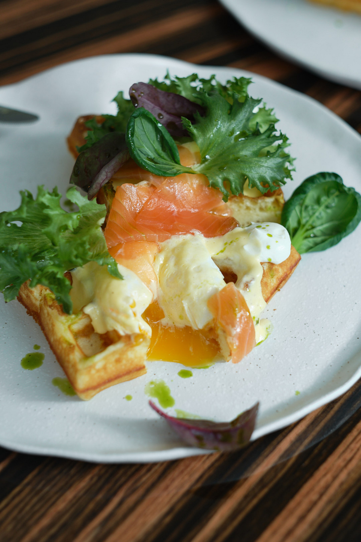 — Вафля с морской форелью, яйцом пашот и голландским соусом;