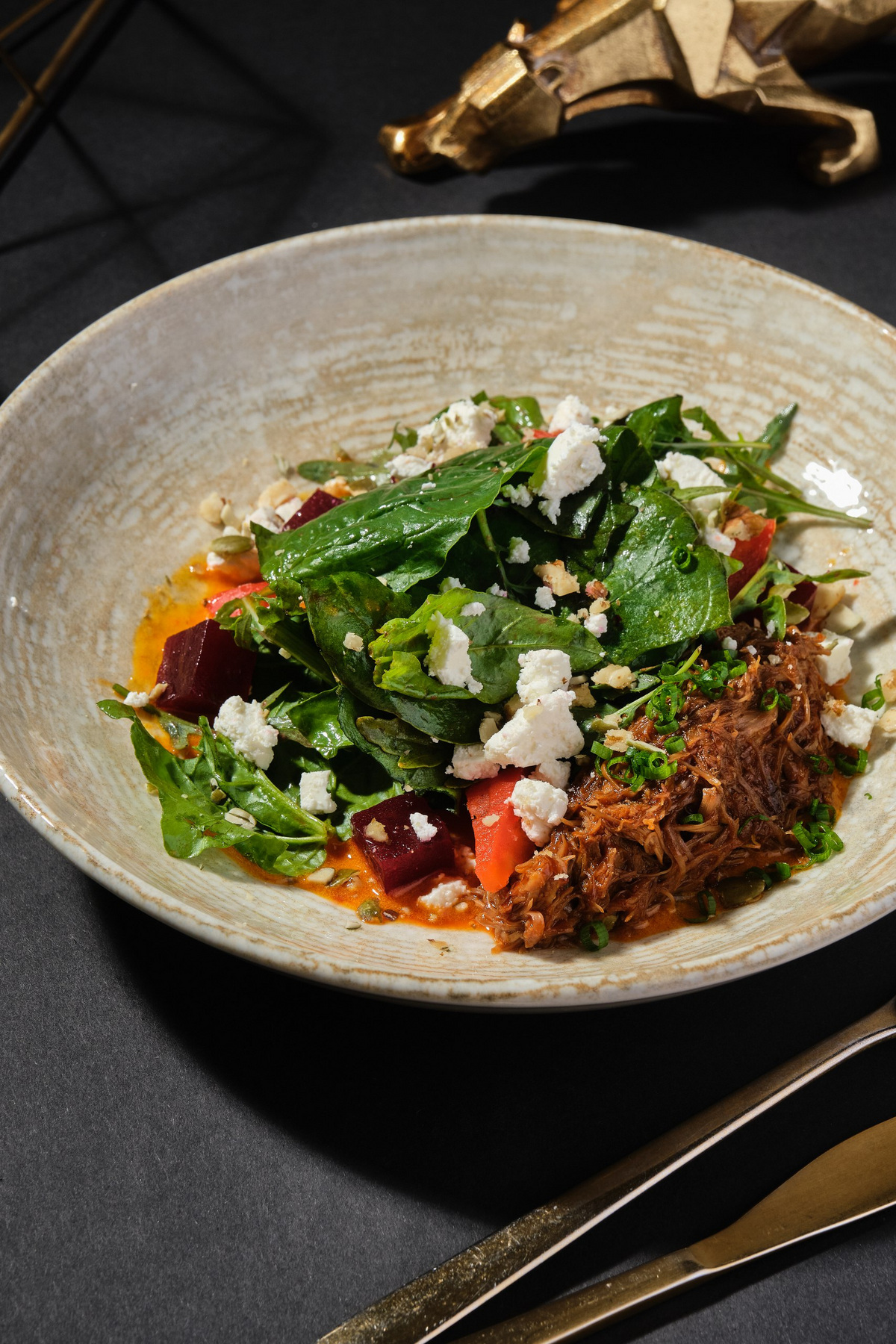 — Салат с печеной свеклой, смородиной и страчателлой;