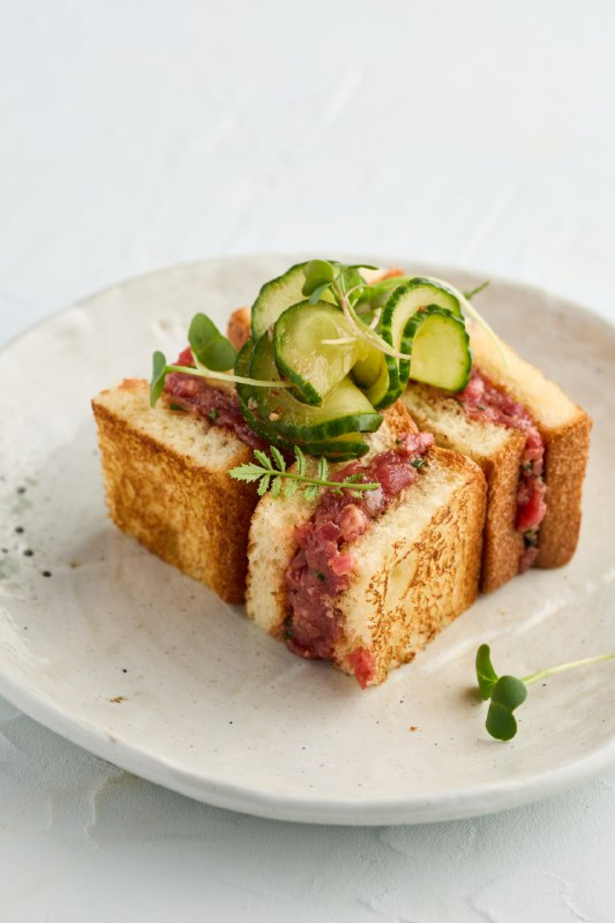 — Кацу сандо с тартаром из говядины и огурцами кимчи;