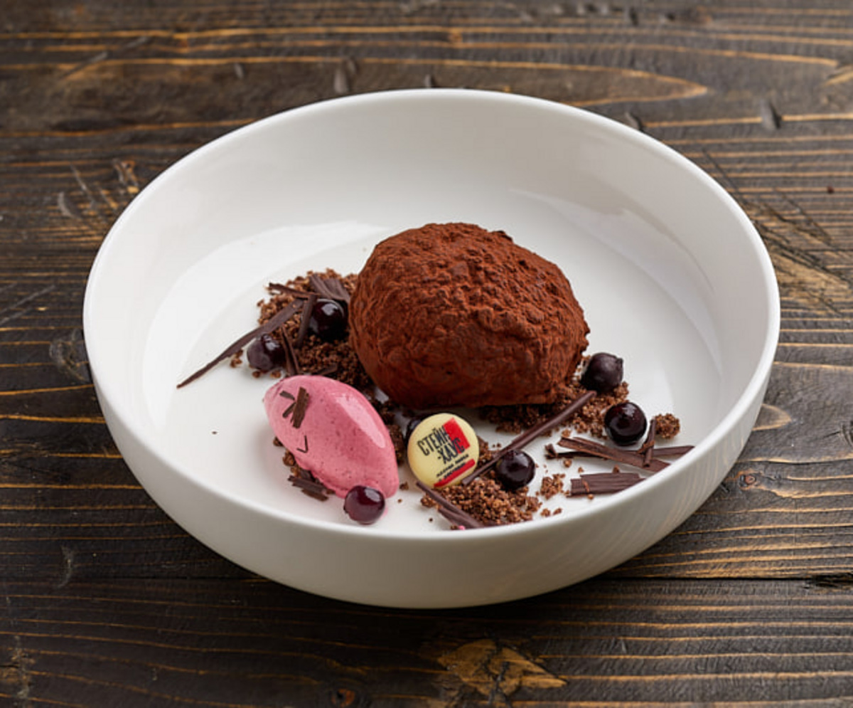В «Стейк-Хаусе» для посетителей предлагают попробовать новый десерт — трюфель из черного шоколада с черной смородиной. Его подают вместе с мороженым.