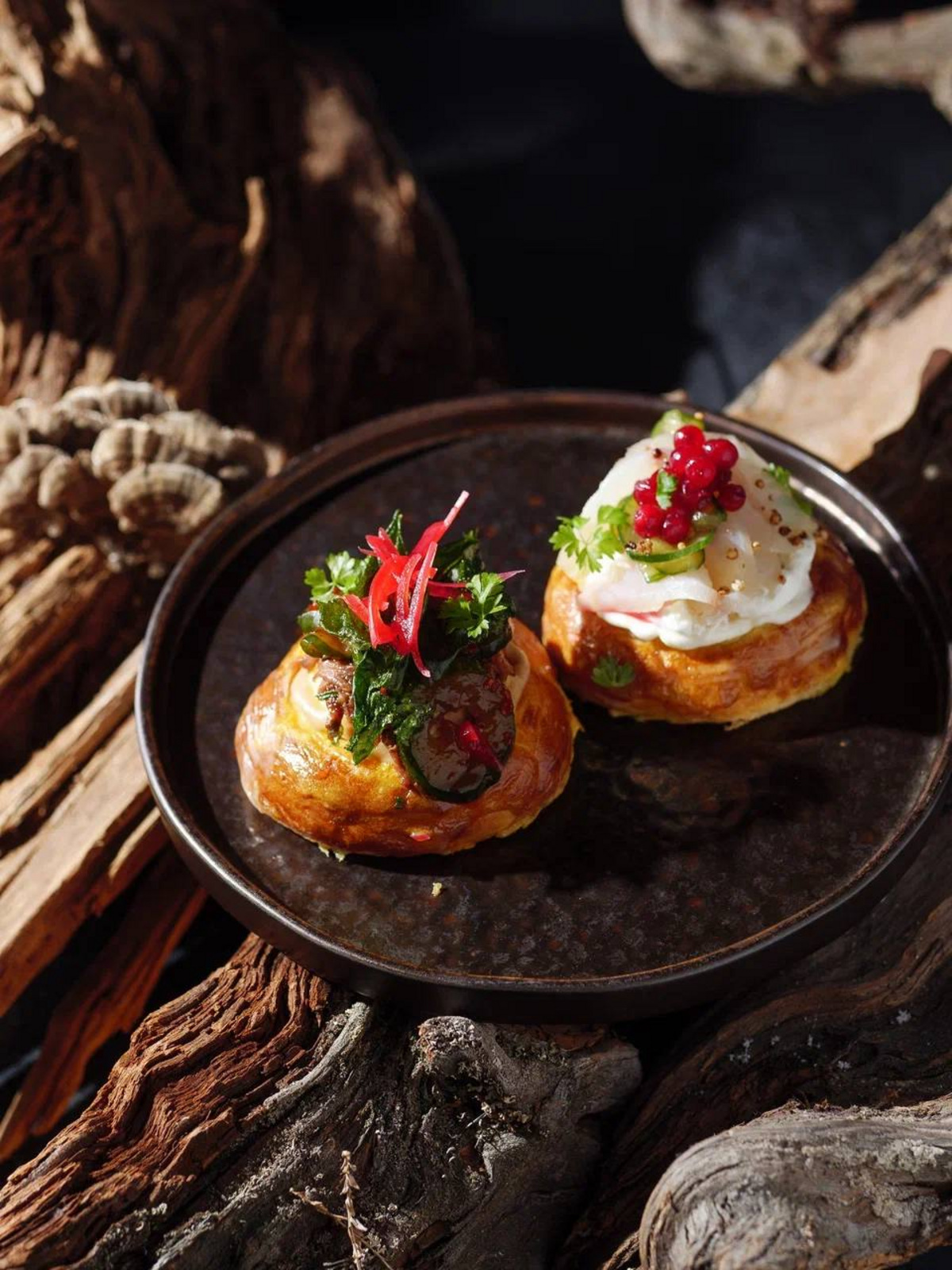 — Мини-шаньги с томленой говядиной; с нельмой Дорадо со шпинатом, оливками и томатами черри в винном соусе; — Филе кабана с соусом из копченого папоротника и крыжовника;