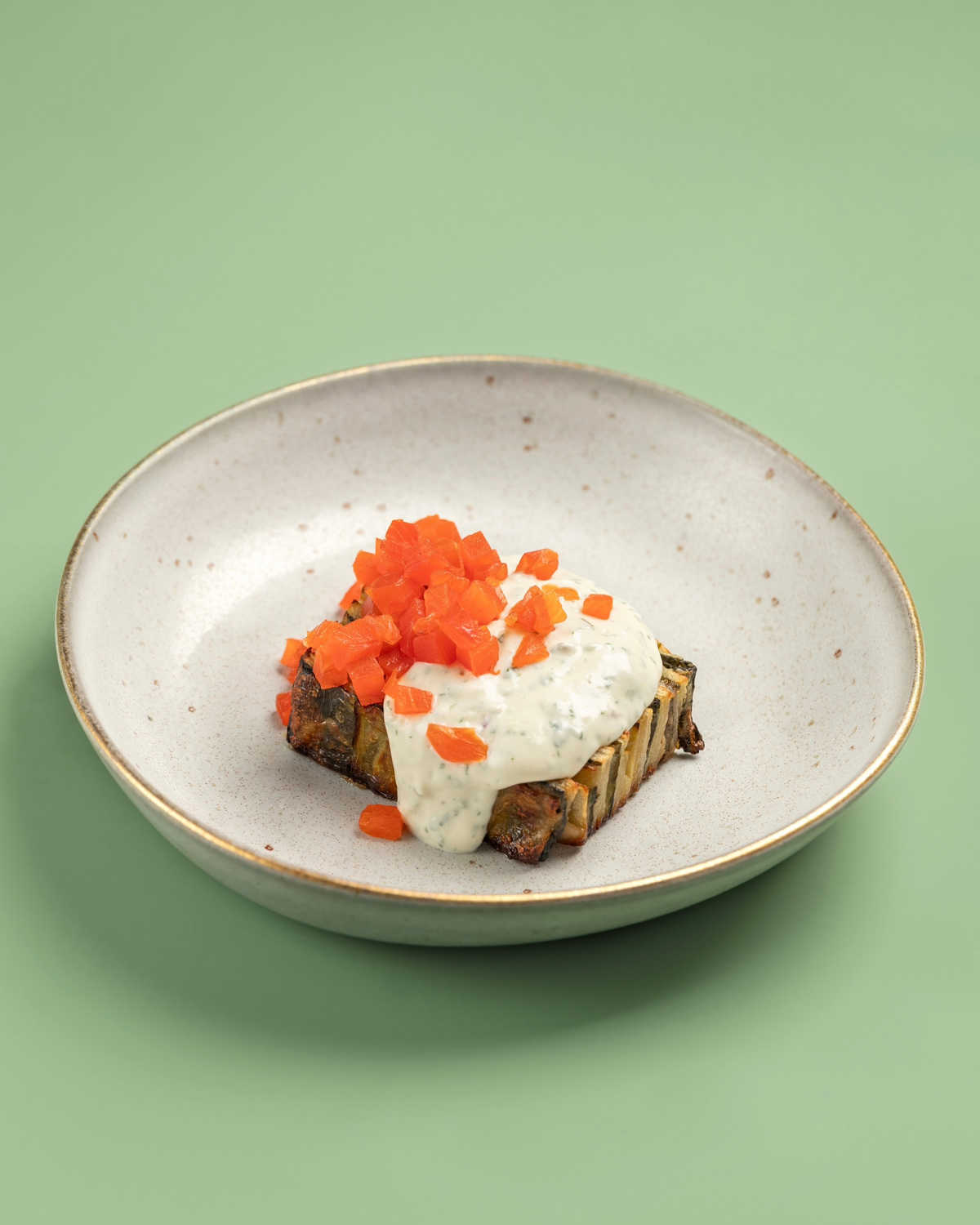 — Запеканка из картофеля и кабачка с соусом Дзадзыки и слабосоленым лососем;